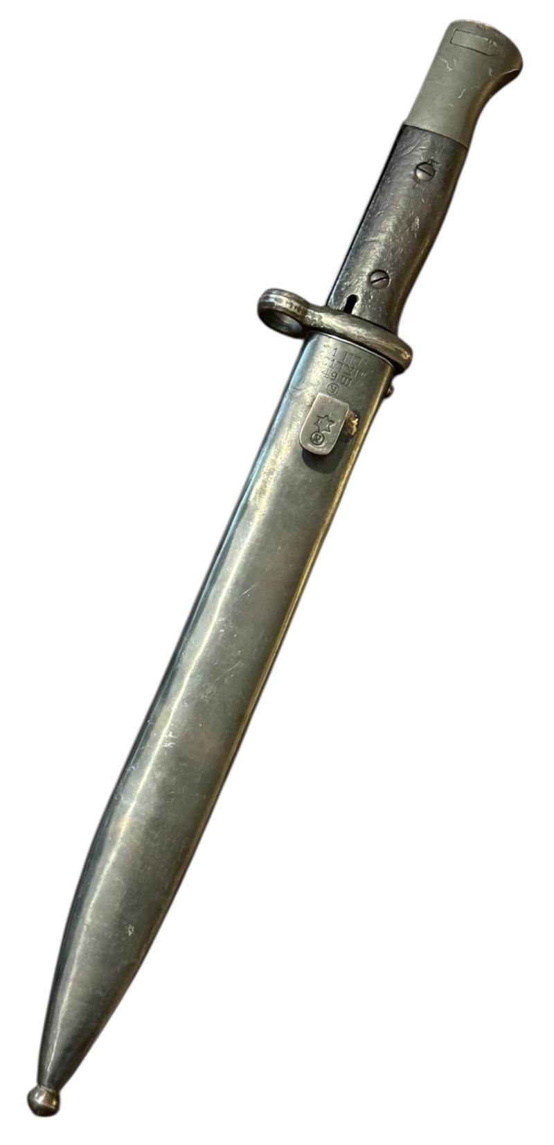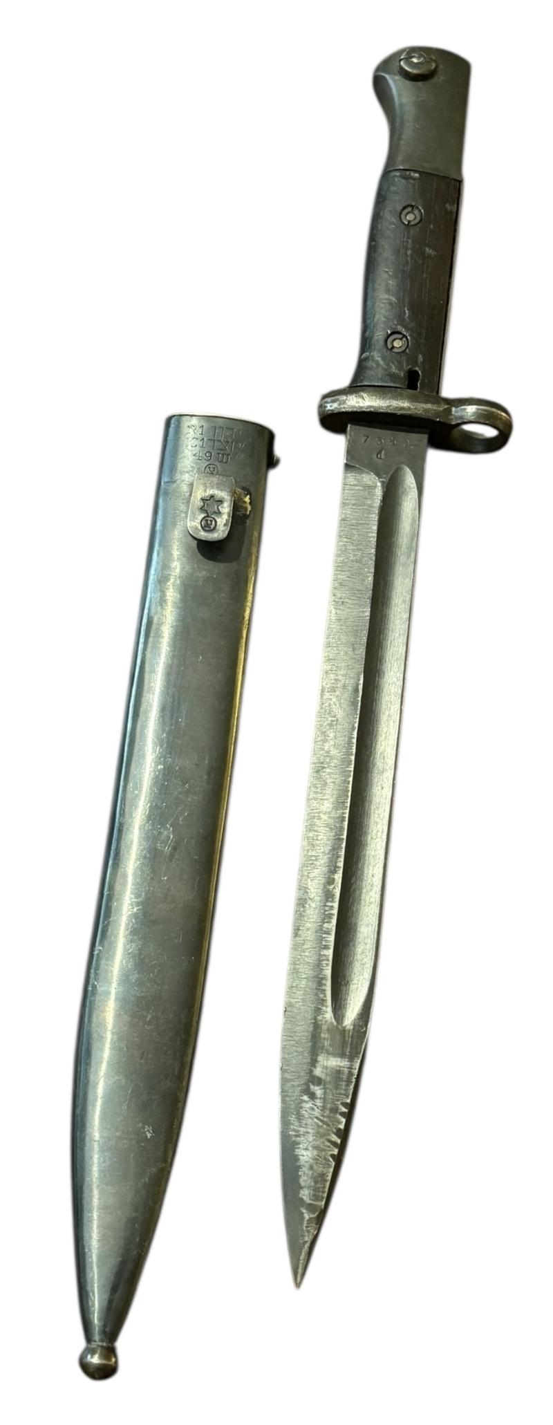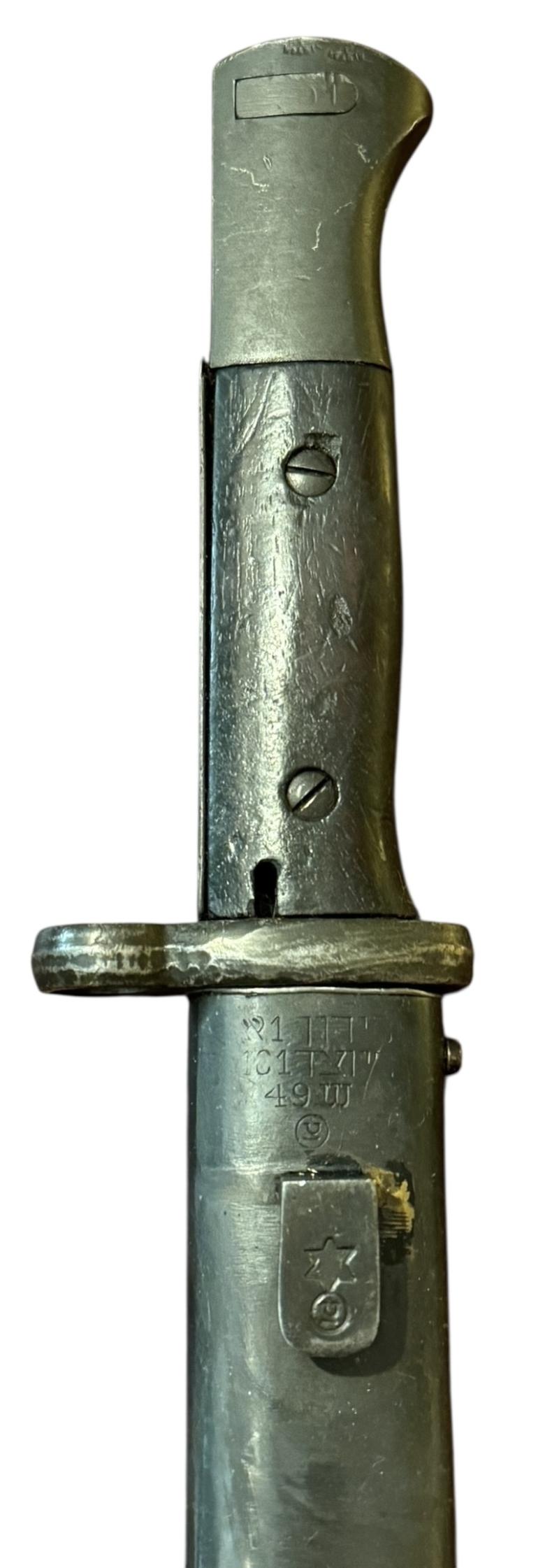 German WW2 made K98 Bayonet converted for the Israëlian Army after WW2 for the re-used K98 carbines. The Bayonet has “Waffen Ambt” markings and Israëlian markings on the scabbard.