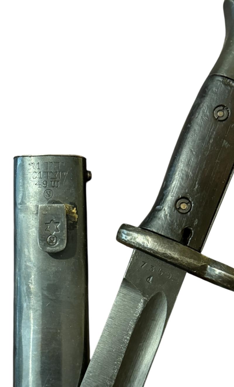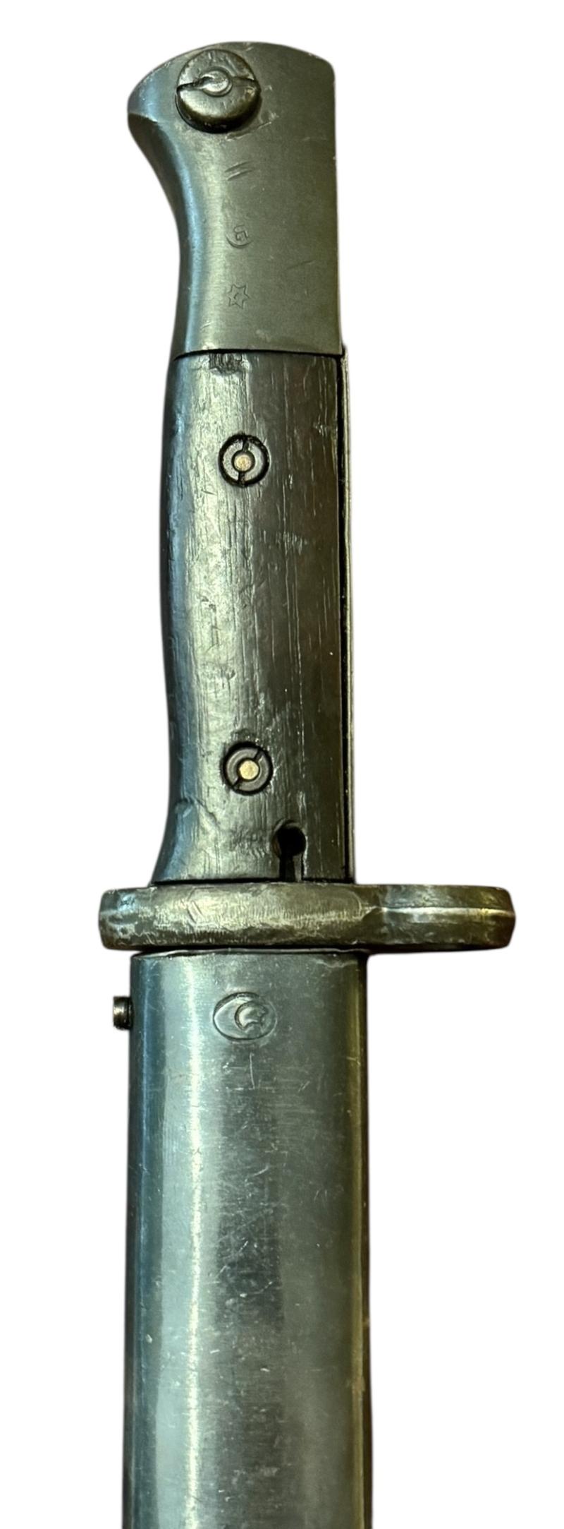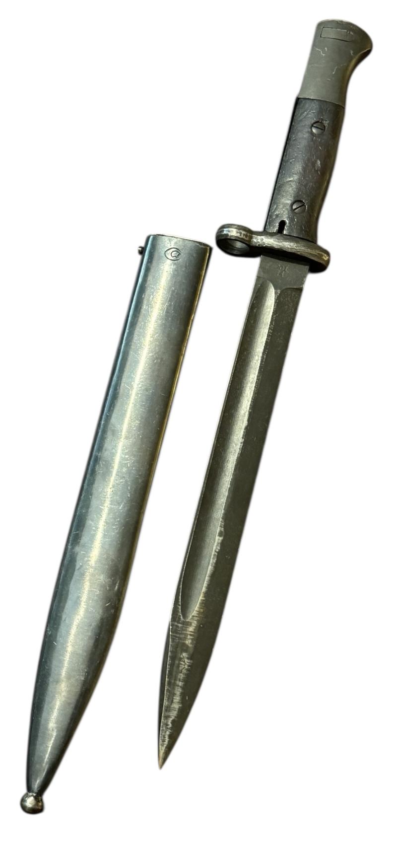 German WW2 made K98 Bayonet converted for the Israëlian Army after WW2 for the re-used K98 carbines. The Bayonet has “Waffen Ambt” markings and Israëlian markings on the scabbard.