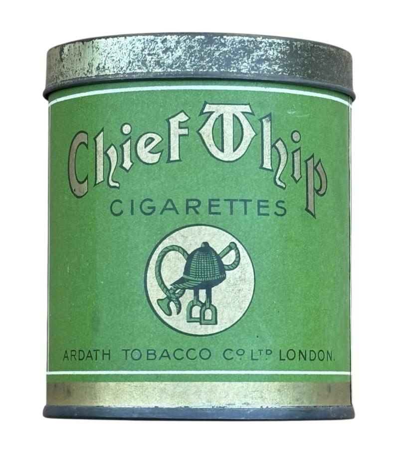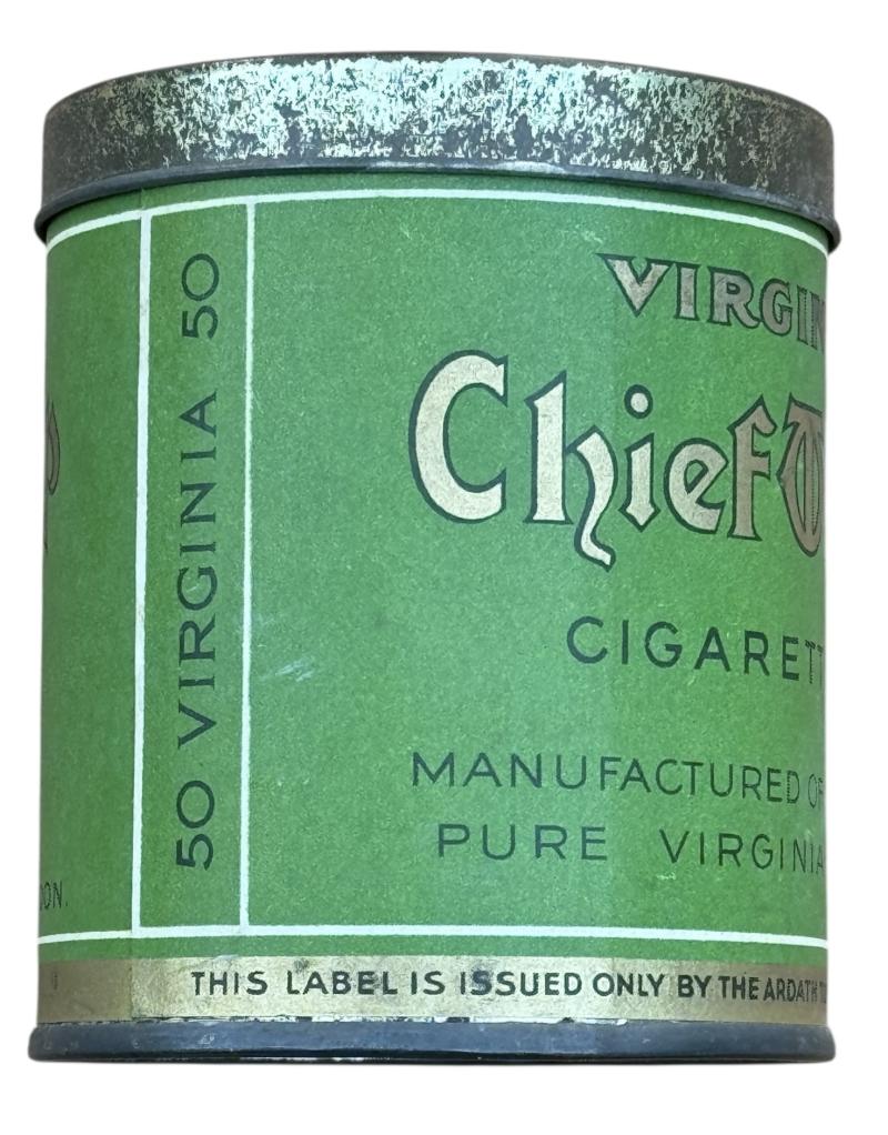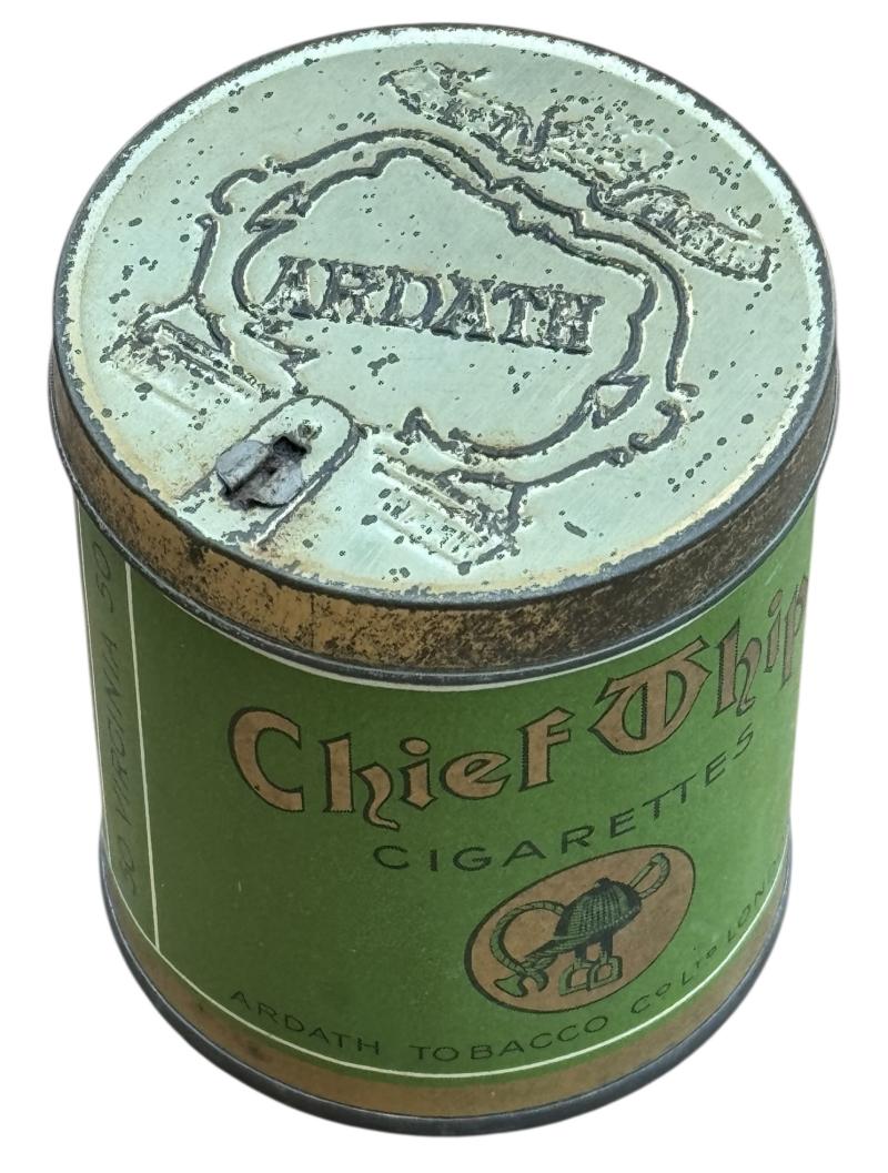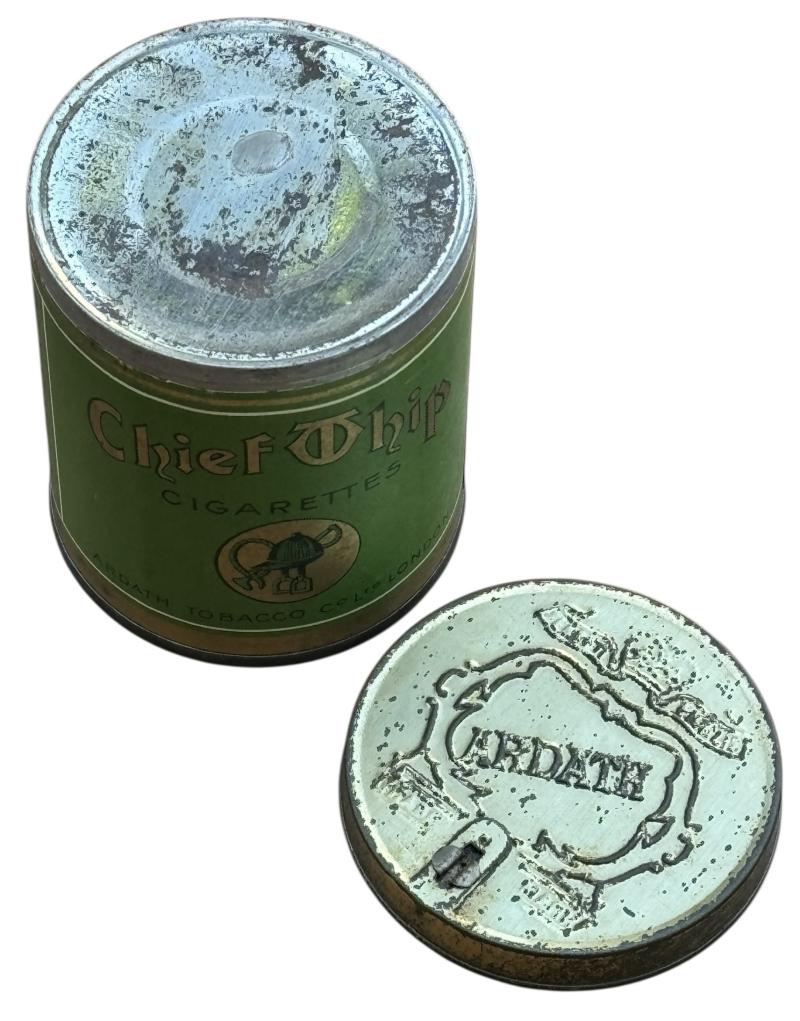 Nice metal cigarette can with original paper label “British WW2 “Chief T chip”