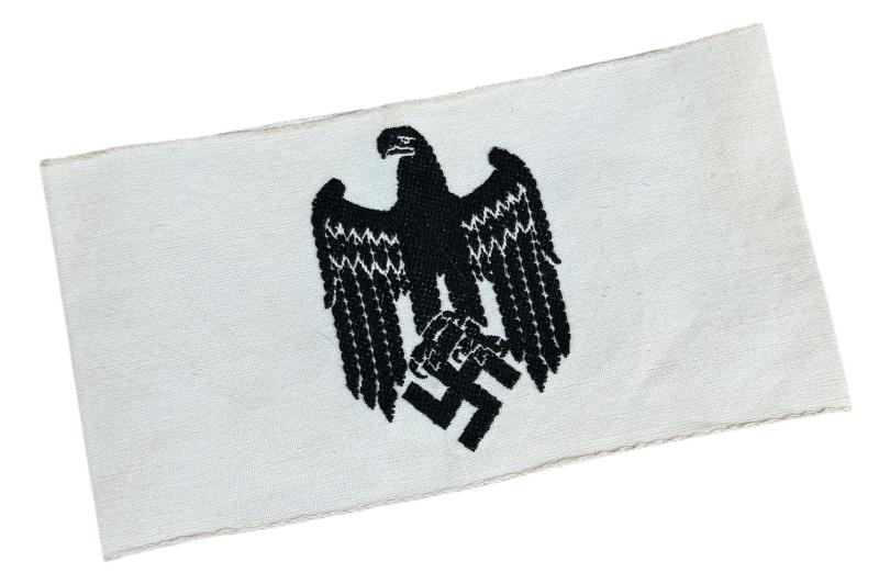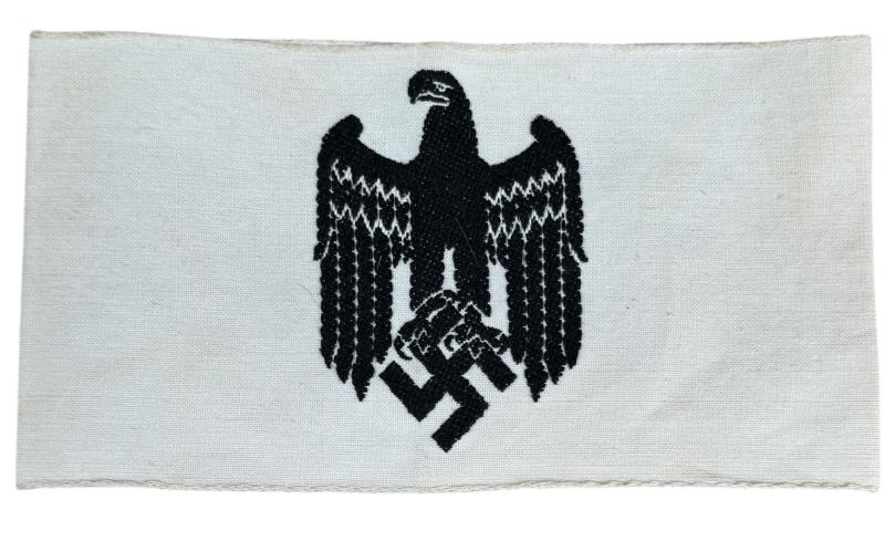 Wehrmacht Civilian Service Armband Fantastic machine woven black Eagle on white cloth Wehrmacht civilian service armband. In very good condition. Great in any armband collection.