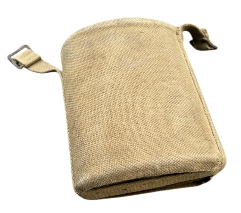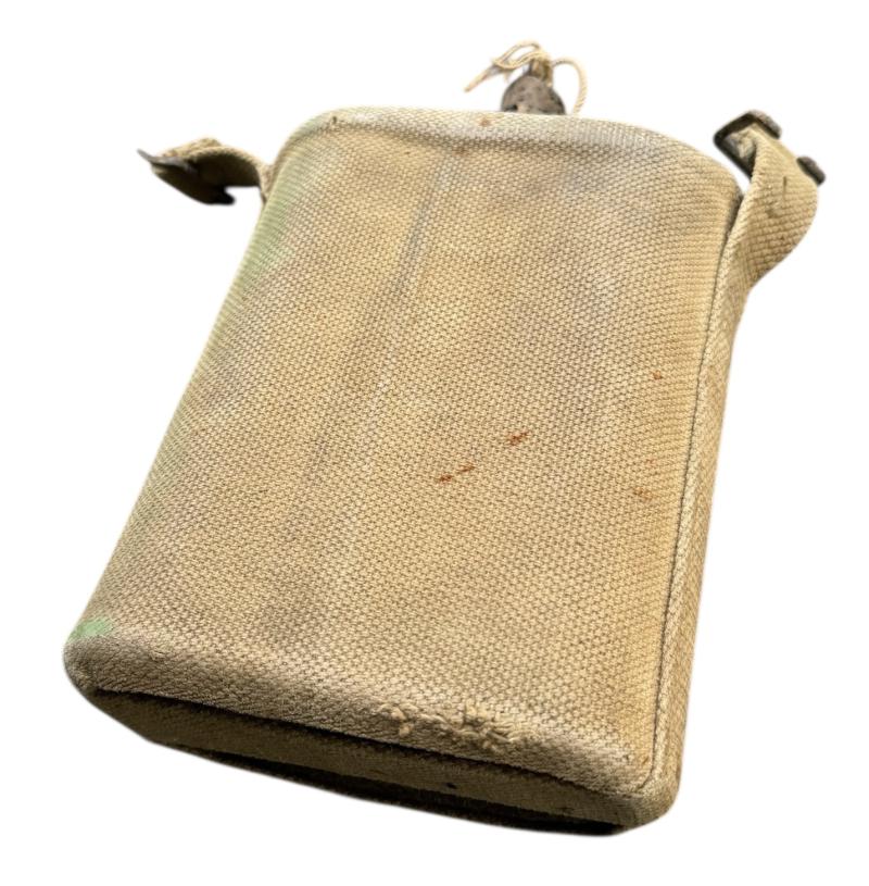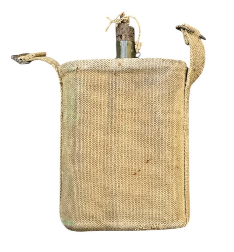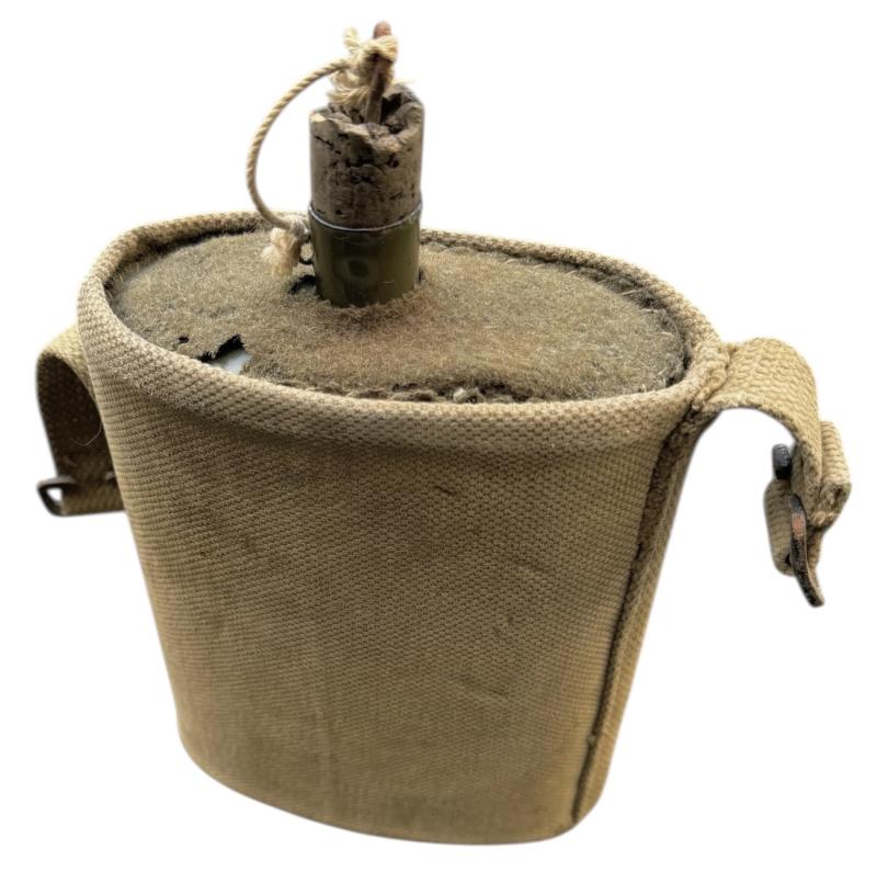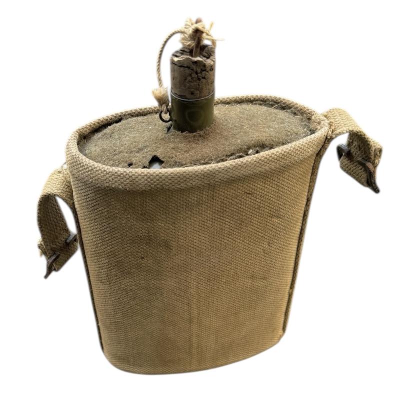 British WW2 Canteen Nice used British WW2 canteen with webbing carrying frame. With green enameled canteen Great to complete British field gear! In very good condition.