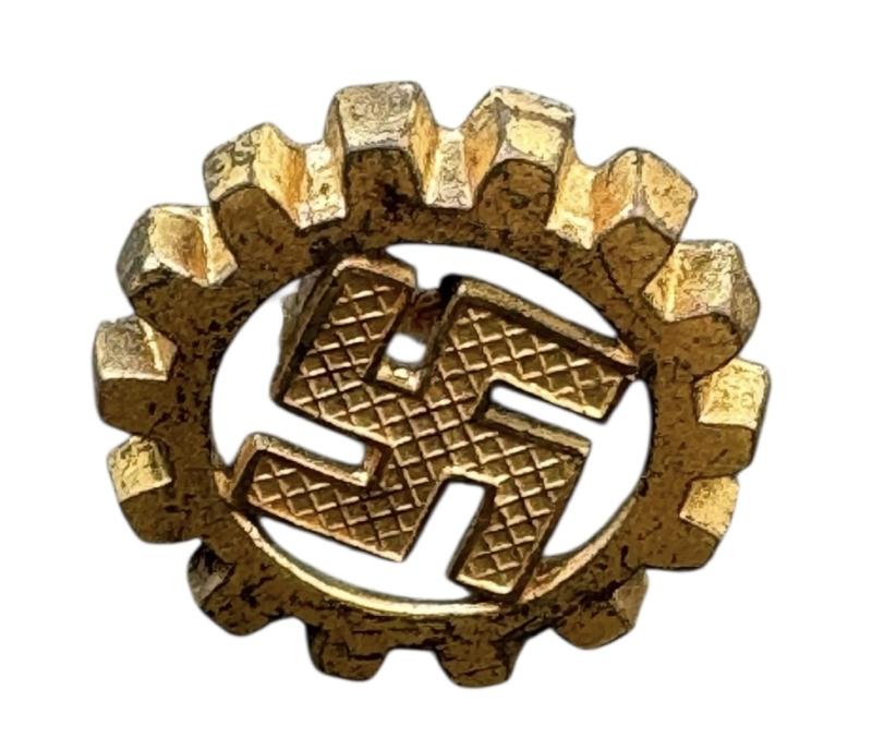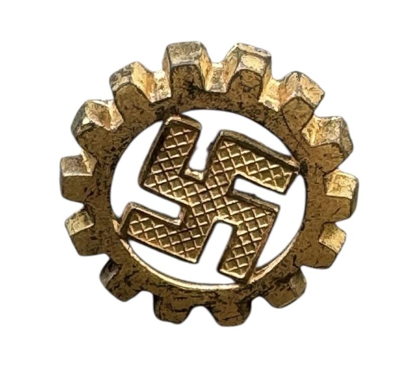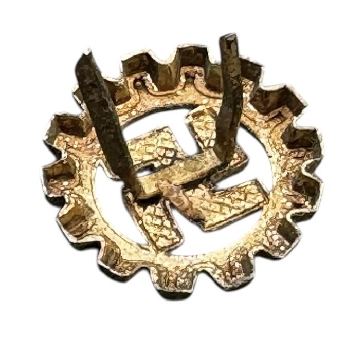 Deutsches Arbeids Front Cap Badge in Gold Nice used aluminum made cap badge in gold. “Deutsches Arbeids Front” With both prongs present. In used but in very good condition!