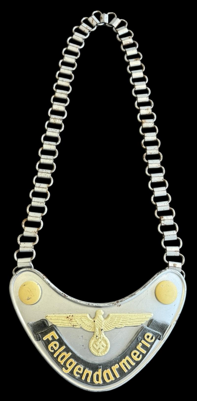 Very nice used Feldgendarmerie Gorget with its original chain. With part of the wellknown clibboard backing! In used but very good condition.