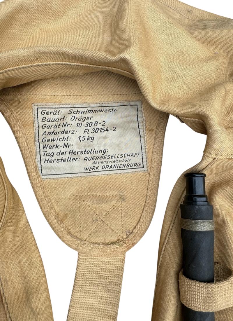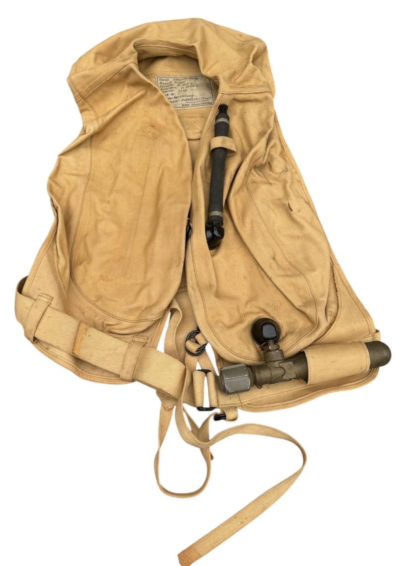 Very nice near mint condition Luftwaffe Pilot/Aircrew Life Vest (Schwimweste). Nicely marked inside with cloth label! complete with the air pressure bottle (with spare seals) and all its straps! Fantastic for a fighter pilot mannequin. Impossible to upgrade!