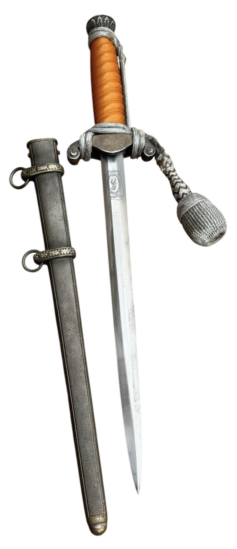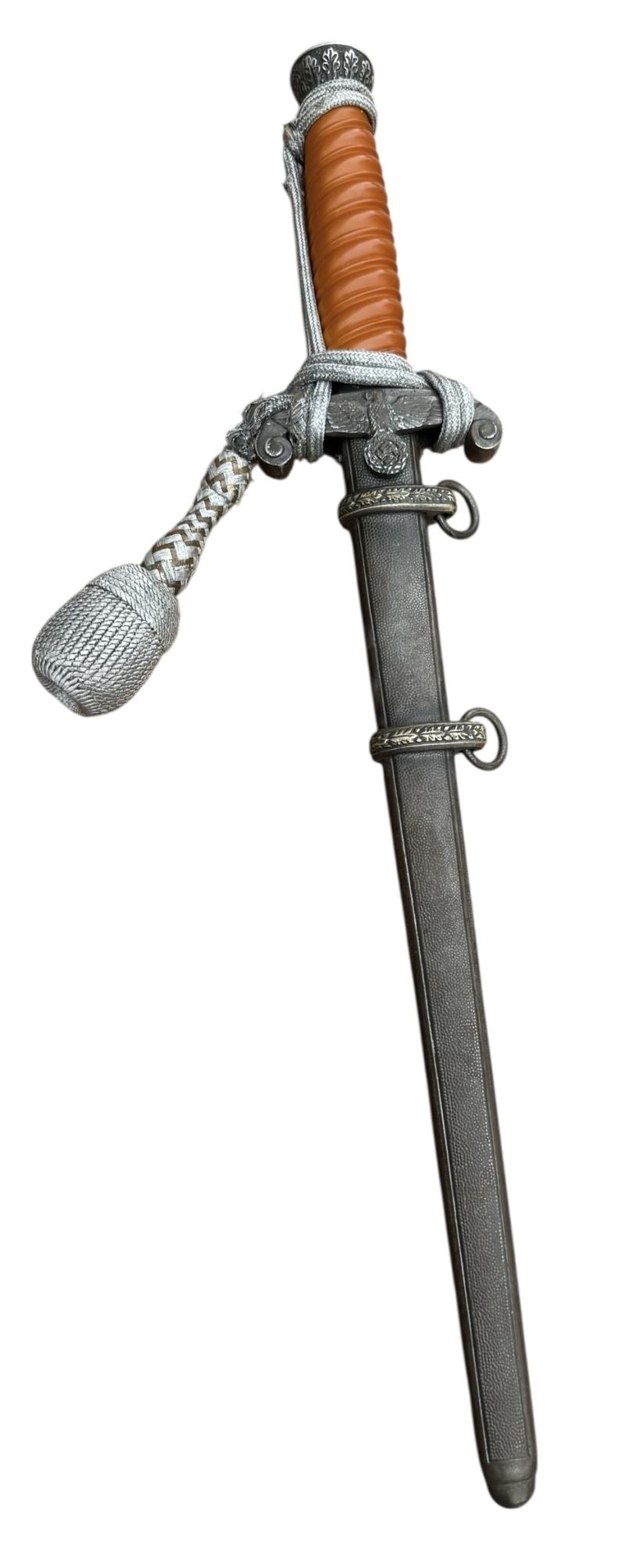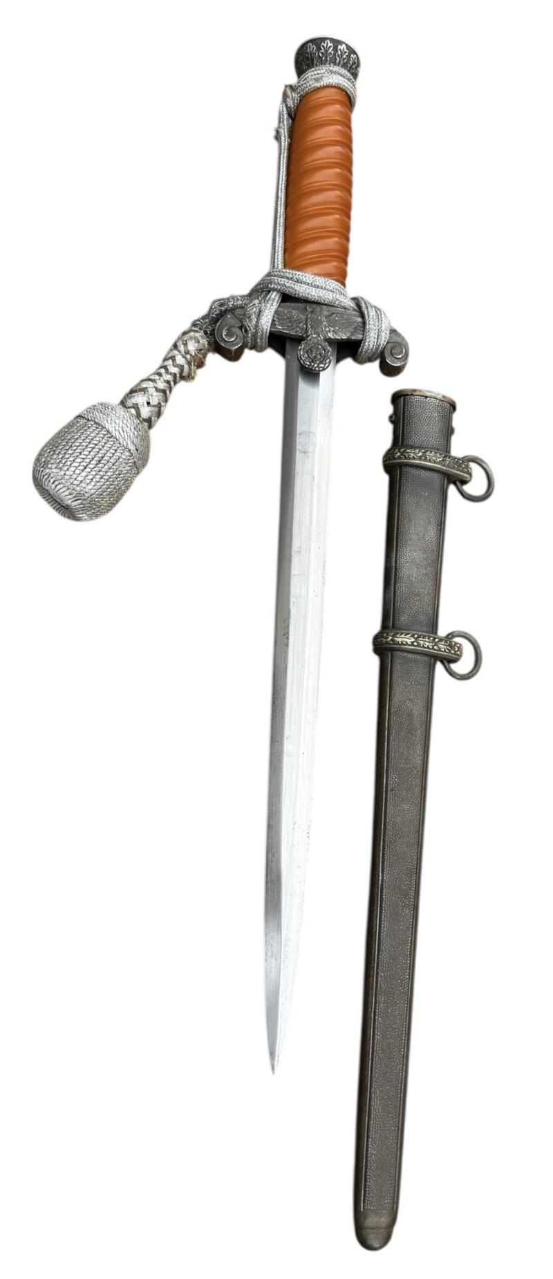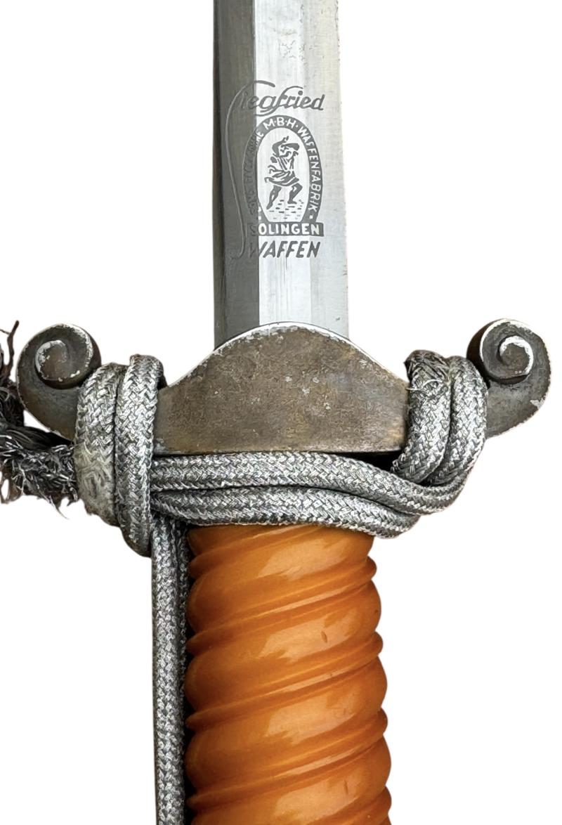 Late war used Wehrmacht Officers dagger with porte pé. Maker marked “Siegfried Waffen, Solingen” In used but very good condition.