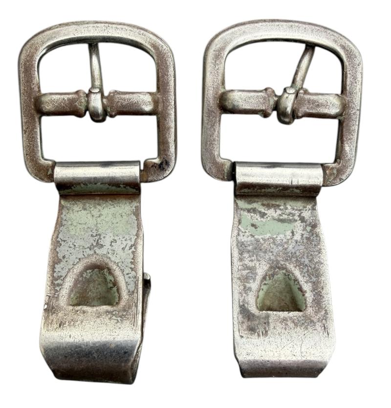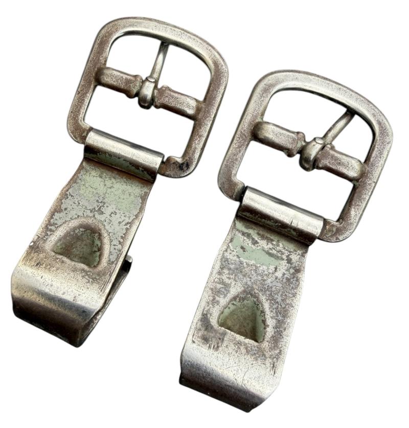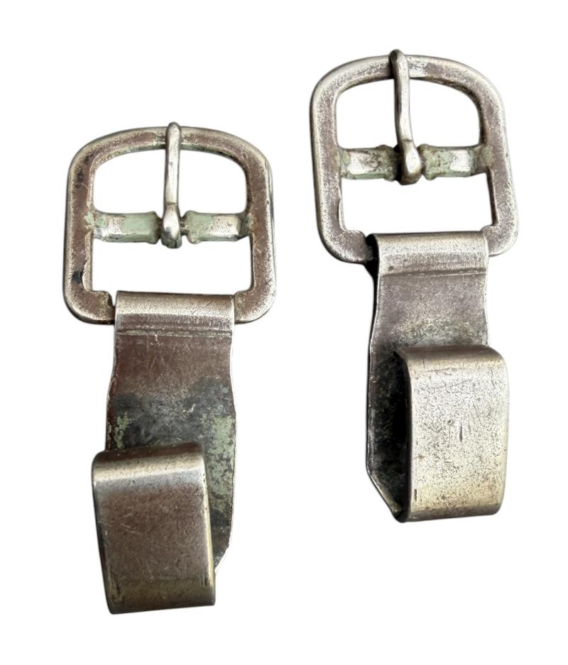 Wehrmacht metal Y Strap (Ammo Pouch) Hooks Fantastic to complete a Wehrmacht combat “Y” strap Or replace a broken hook. In used but good condition.