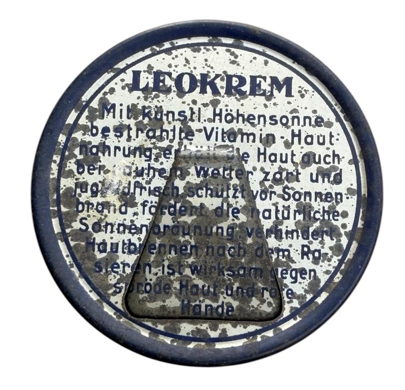 Third Reich era Leokrem (Skin Cream) Very nice metal can “Leokrem” (skin cream) This can never had content, becauce is was made as shop display for on the counter. In very good condition.
