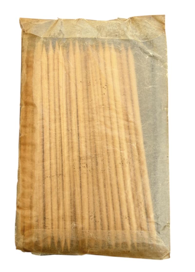 Wehrmacht era Toothpicks Original packaging with content of Wehrmacht era toothpicks. “Dento, der hygienische runde Holz-Zahnstocher” very nice for a personell items collection. In very good condition.