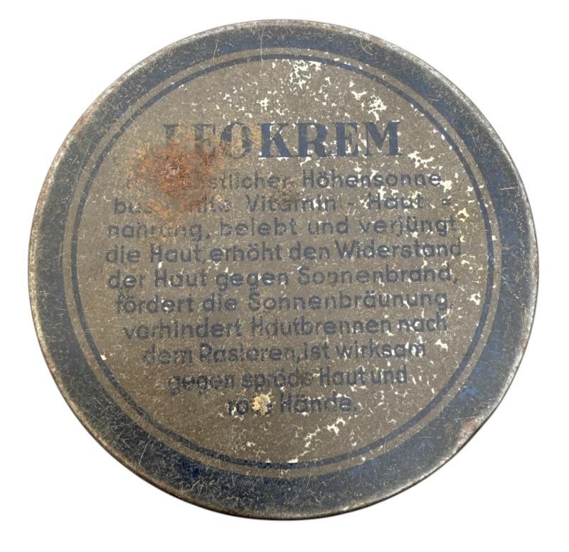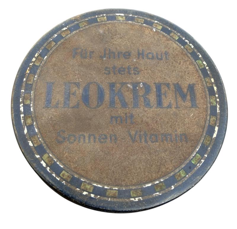 Third Reich era Metal Can Leokrem (Skin care) Nice used decorative Third Reich era metal can “Leokrem, Für ihre Haut stets mit Somnen vitamin” Great for display!