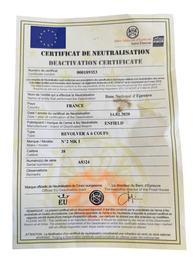 De-activated according EU Law) sold to people over years !! The EU regulation 2015/2403 came about as a result of the attacks in Paris. The regulation applies throughout Europe. In all EU countries, weapons must be disarmed in the manner described in the EU regulation. The disarmed weapons then no longer have to be seen as firearms. The weapons must be provided with a certificate from 1 of the controlling authorities from 1 of the EU countries. They must also be marked by stamped stamps showing the deactivation. From our private collection.