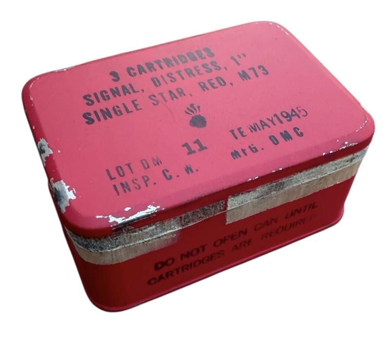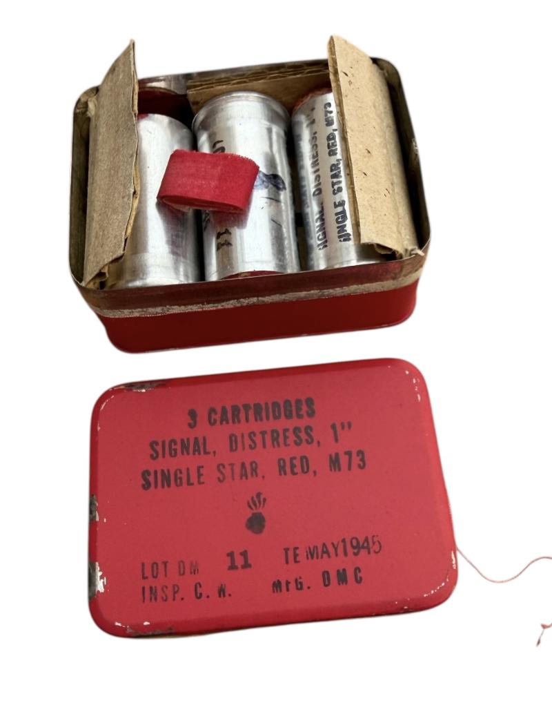 Very nice decorative US WW2 red metal tin with 3 (empty) red flares. Marked “3 Cartridges Signal Destress 1” and “Single Star Red M73”