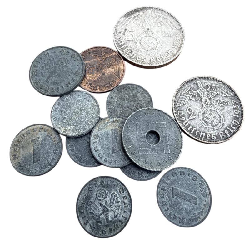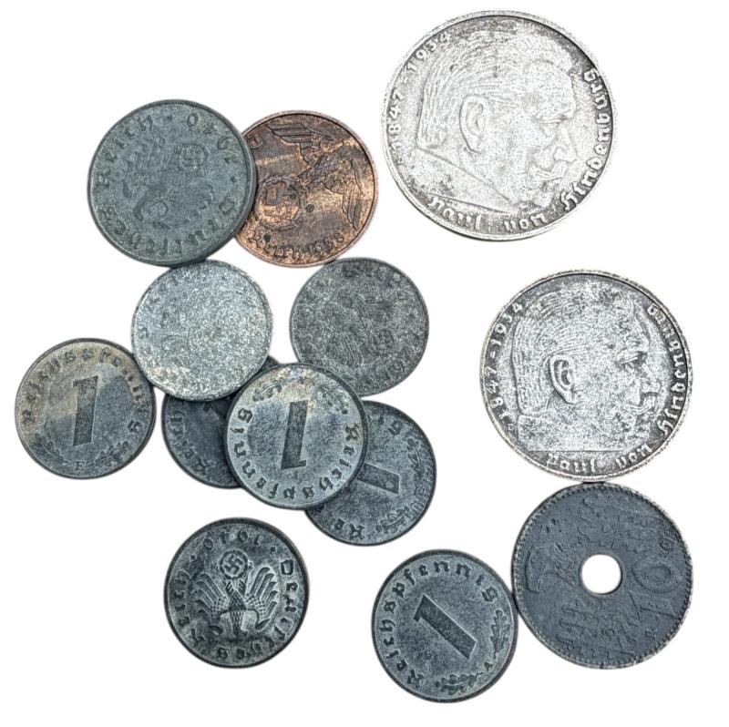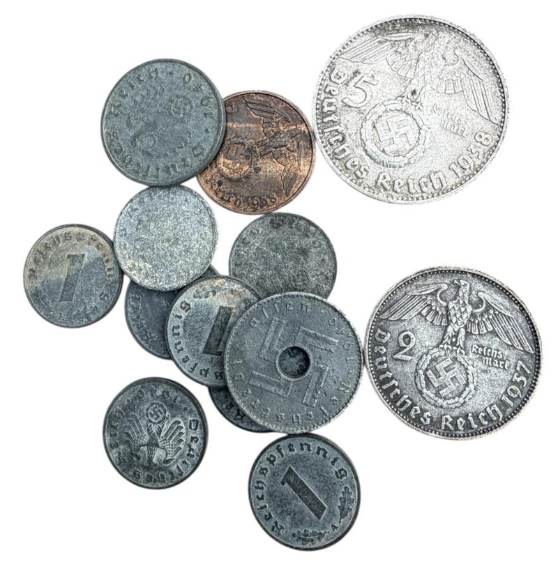 13 Third Reich Coins Very nice Third Reich coins, silver and sink ones With swastika’s and “Hindenburg” head. In 5 & 2 Reichsmark, 1 & 2 Reichspfennig. In good condition. Great for display!