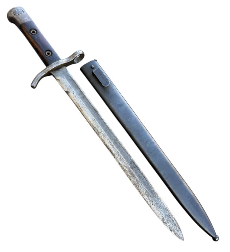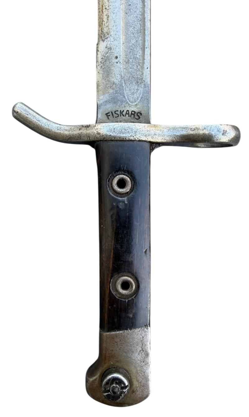 Made by “Fiskars” this Finish model 1927 type “Kwään Pistin M/27 Bayonet. With hollow rivets in the wooden grips. With its original metal scabbard.