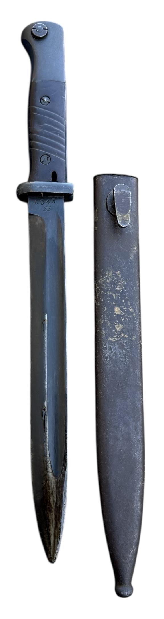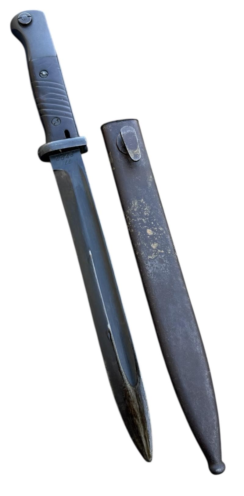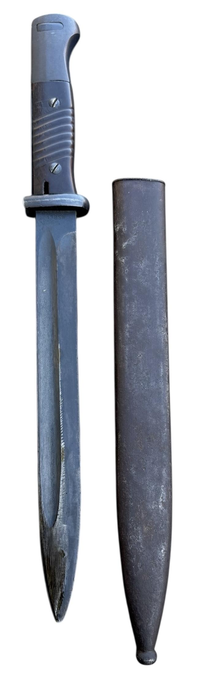 K98 Bayonet model 1884/98 Nice used K98 bayonet for the K98 Mauser Karabiner Maker code marked “ASW” and dated “1943” With non matching metal scabbard. Overall a nice used K98 bayonet in used but good condition.
