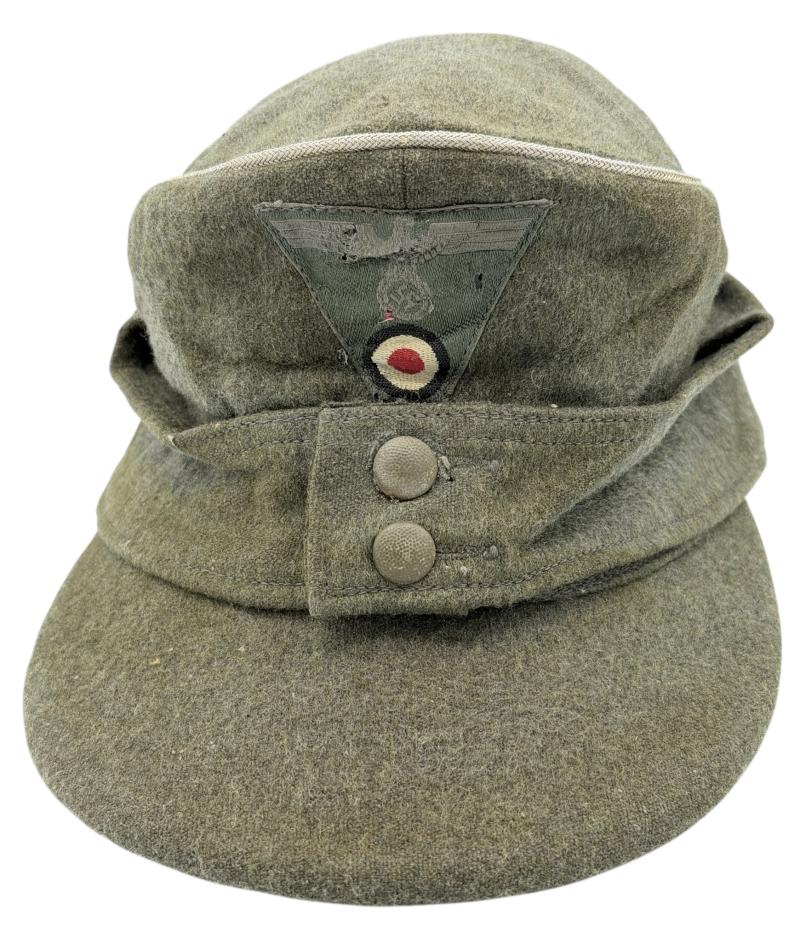 Used but nice un-touched Wehrmacht M43 cap “Einheitsmutze” with original sewed so-called “Trapizoid” eagle/cocade insignia with minor moth nips. But overall a very nice used M43 Einheitsmutze in size “57” in good condition. Great on a mannequin or as part of a headgear collection.