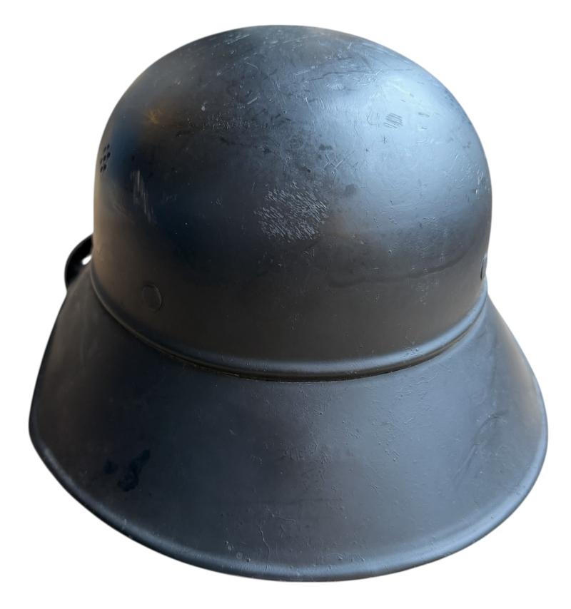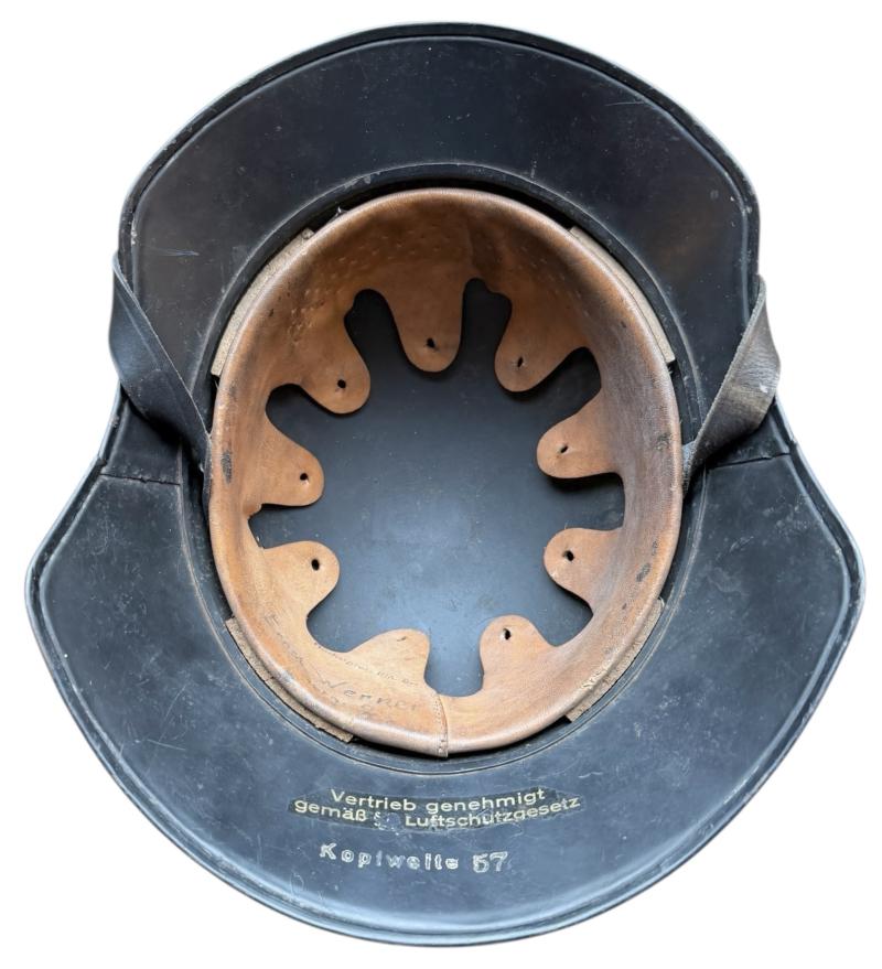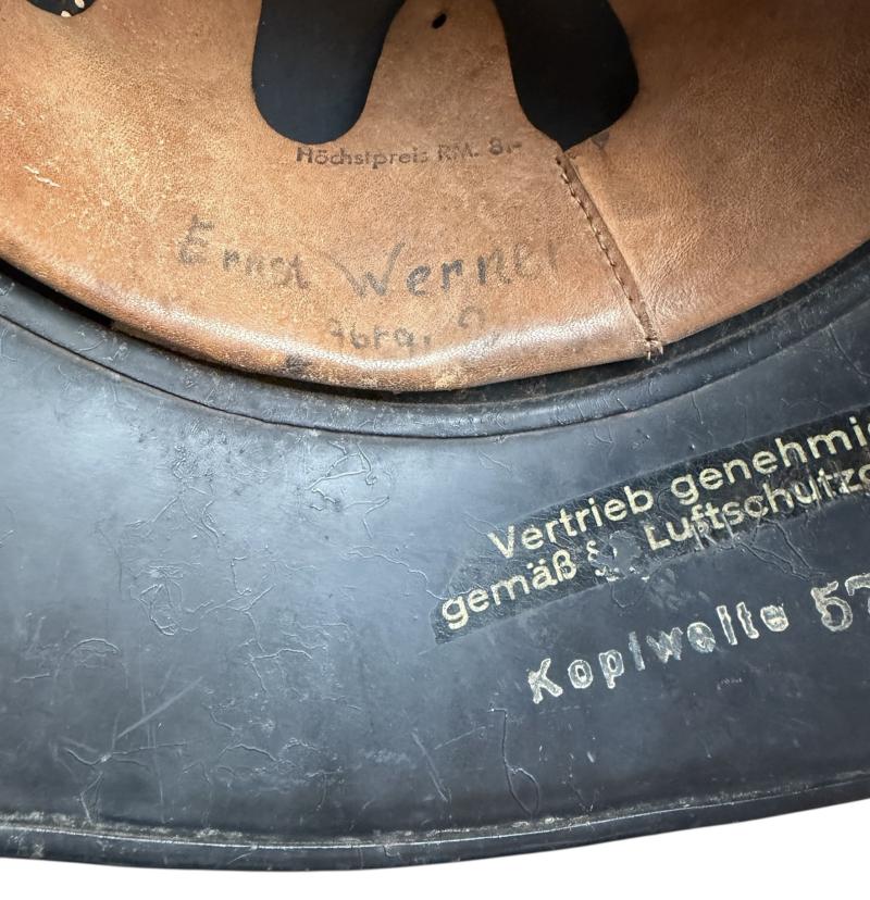 Very nice used and named Luftschutz so-called “Gladiator” helmet. With its original “Luftschutz” decal and liner. Named “Ernst Werner”.