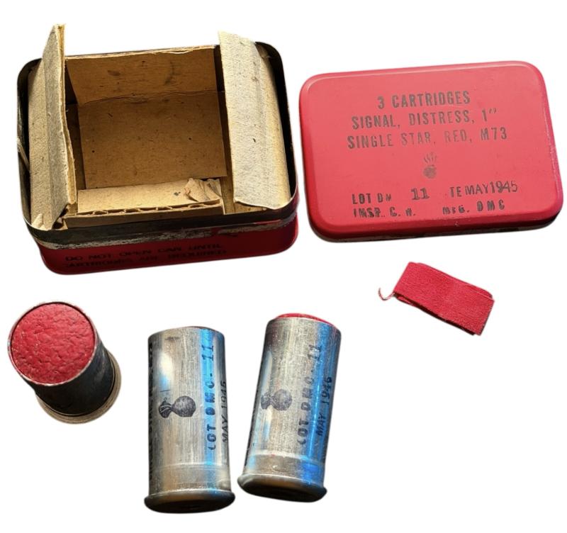 Very nice decorative US WW2 red metal tin with 3 (empty) red flares. Marked “3 Cartridges Signal Destress 1” and “Single Star Red M73”
