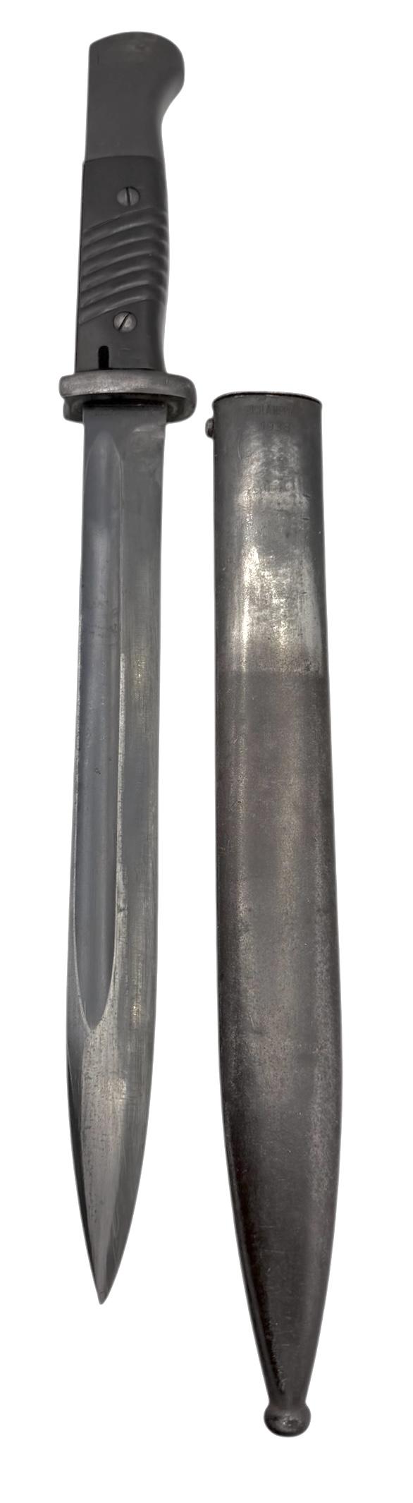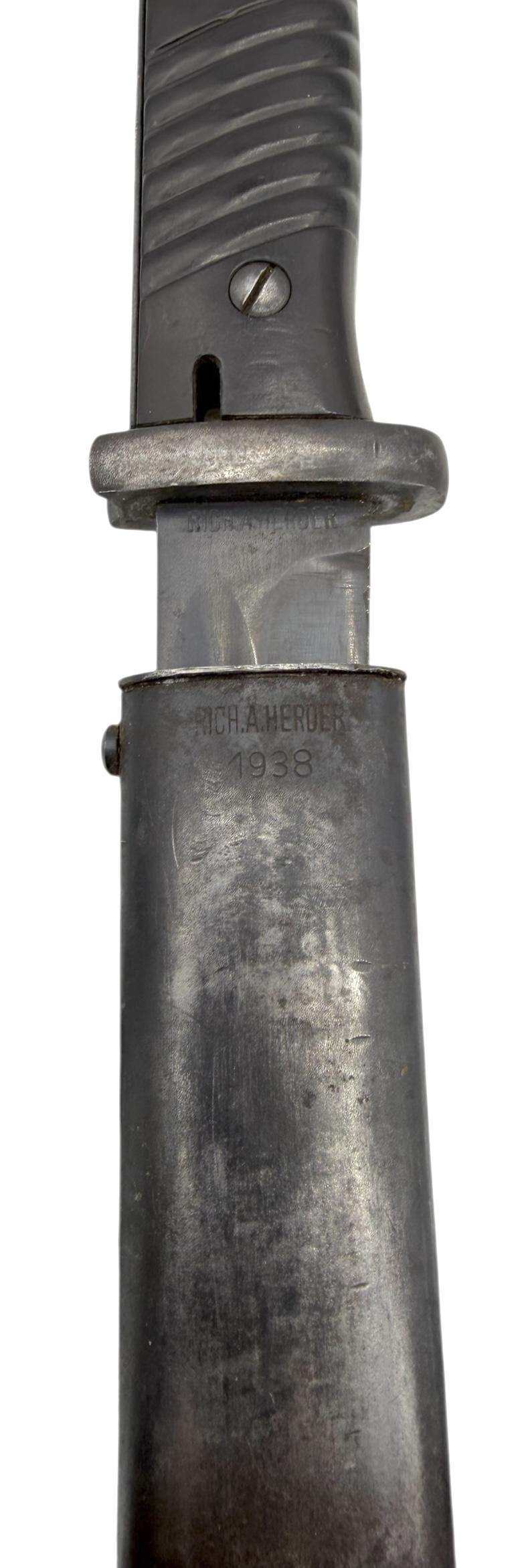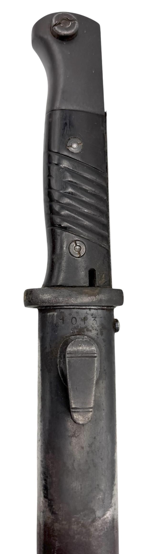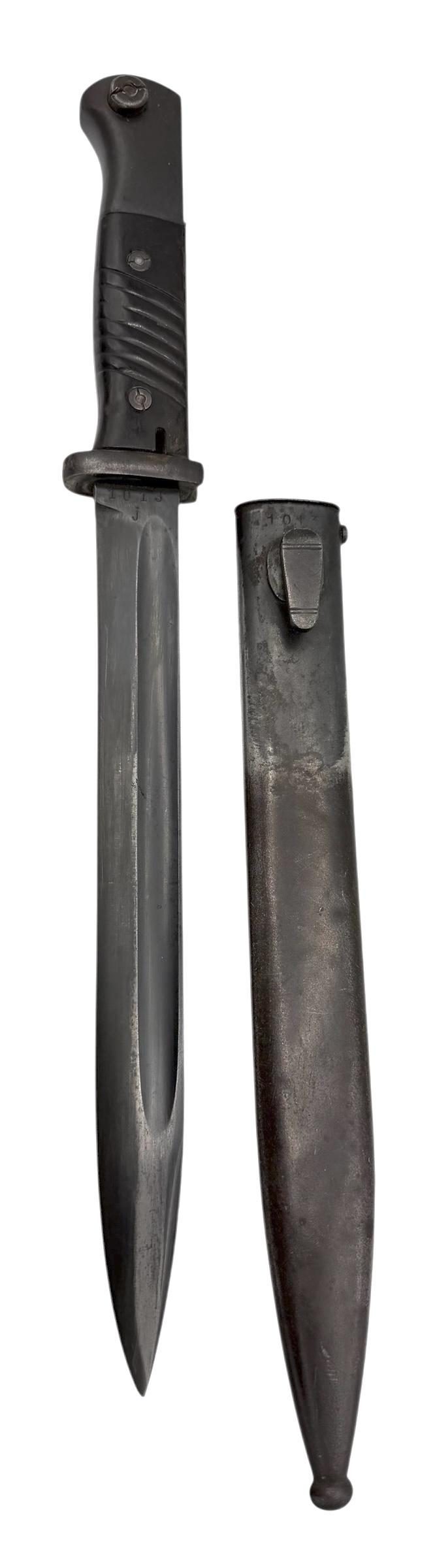 with number “1013 J” both marked on bayonet and its scabbard. On the back of the blade the bayonet is also marked “38” with bakelite grips.