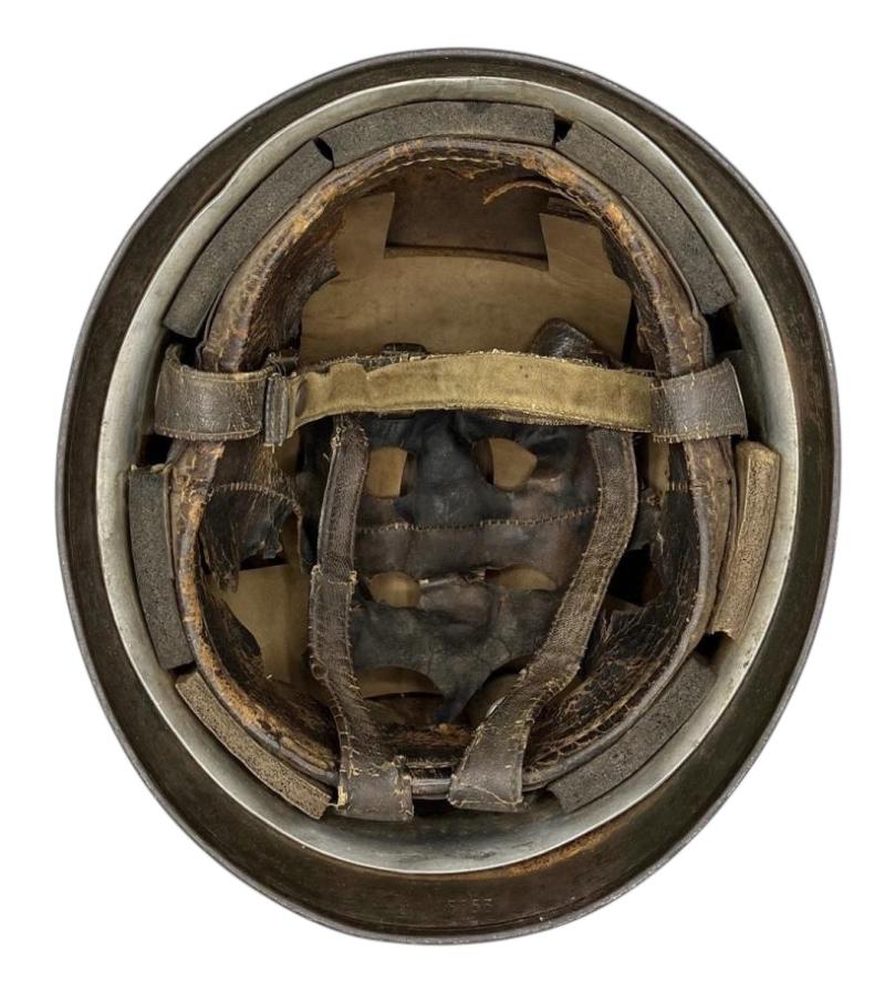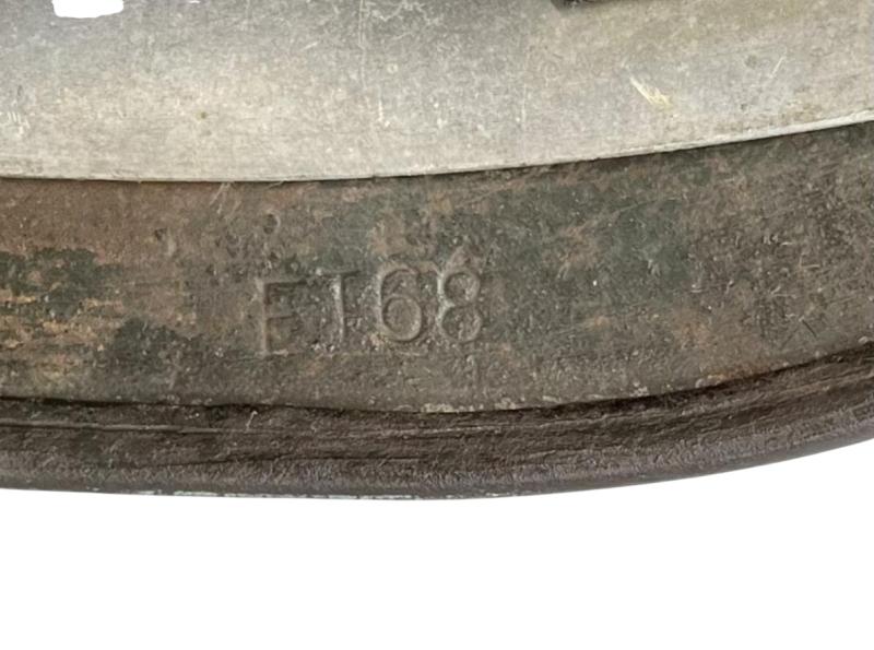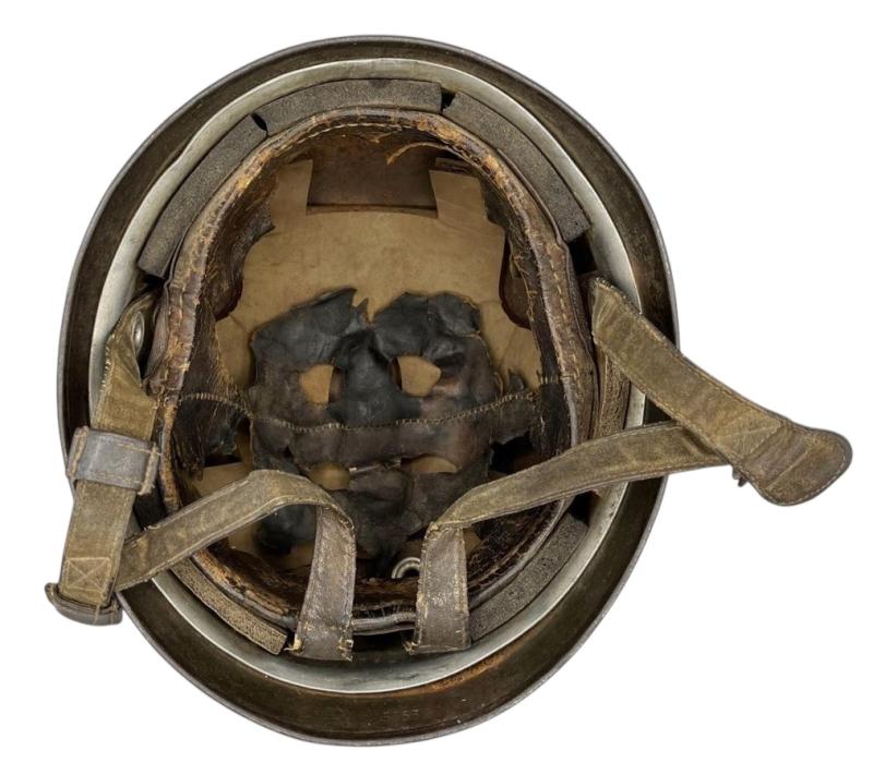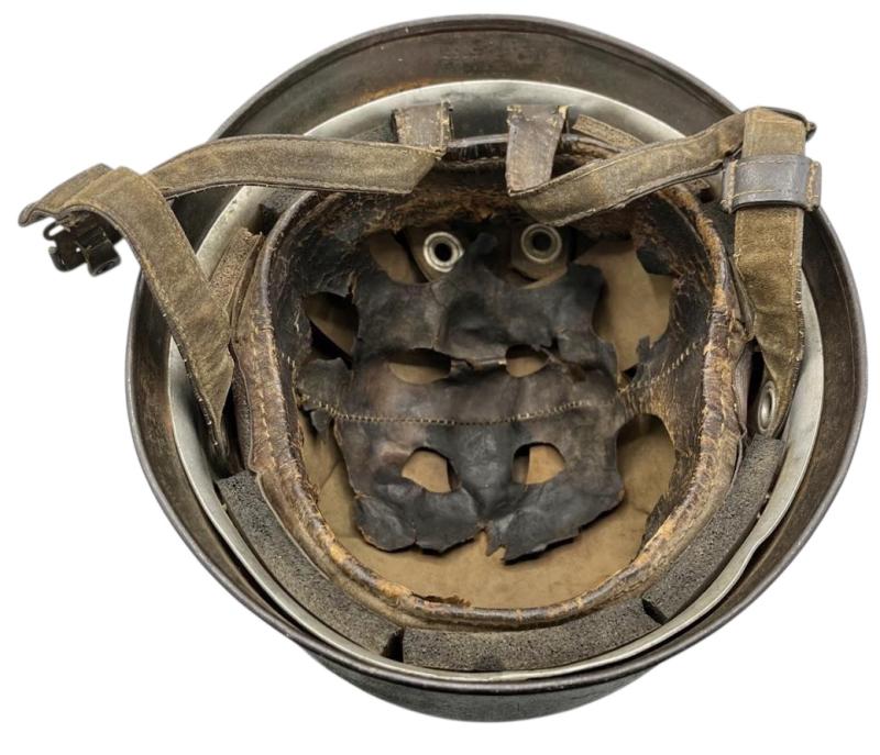 Helmet is maker marked “ET” which is “Eisenhuttenwerk, Thale” in size “68” with its original liner and helmet straps. Liner is originally wartime attached with with regular german helmet cotter pins!