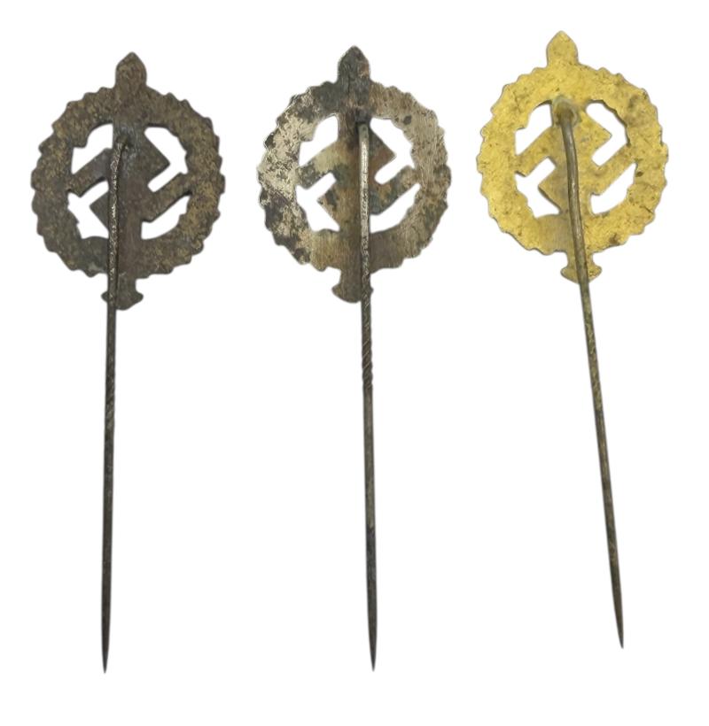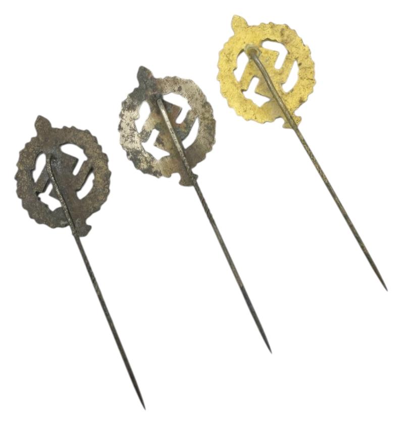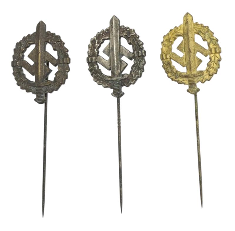 3 SA Sport Badge Stick Pins “Bronze Silver & Gold” Very nice SA Sport badge stickpins in “Bronze, Silver & Gold” in used but in very good condition. Nice in a medal collection!