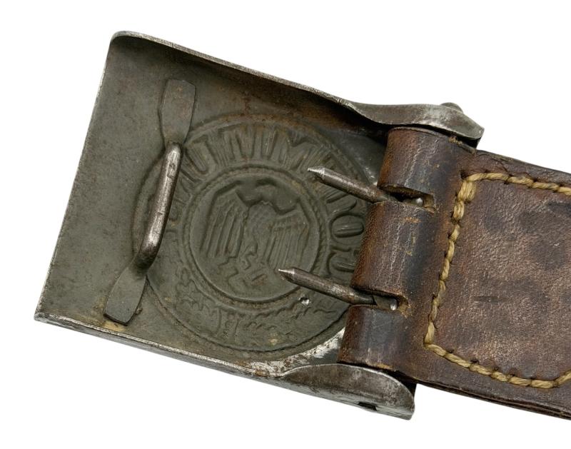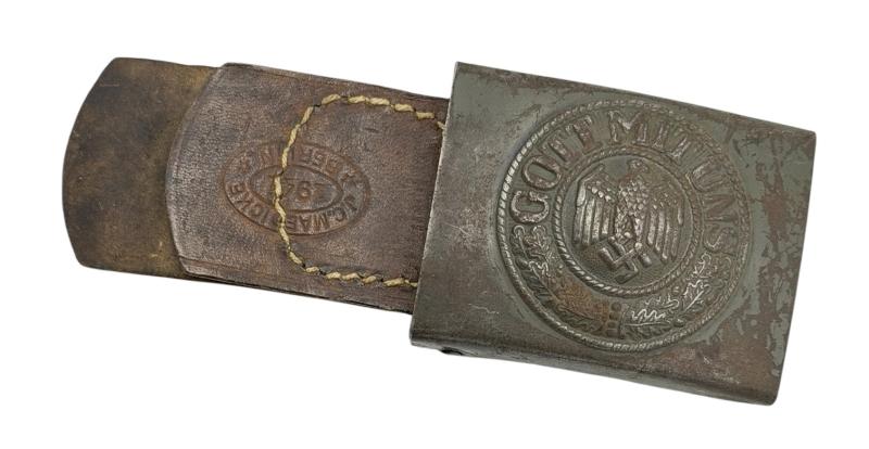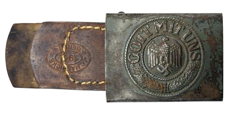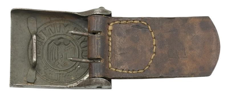 Very nice used Wehrmacht belt buckle with leather tab. In 85% of its original field/grey camo paint