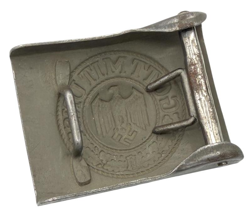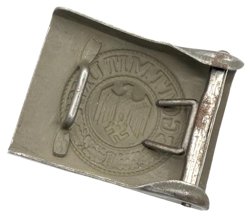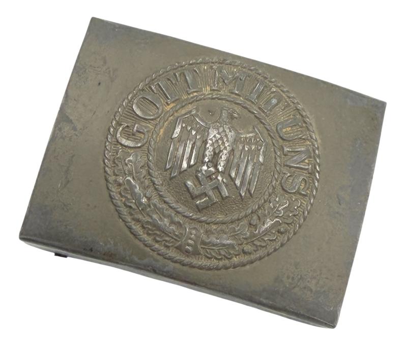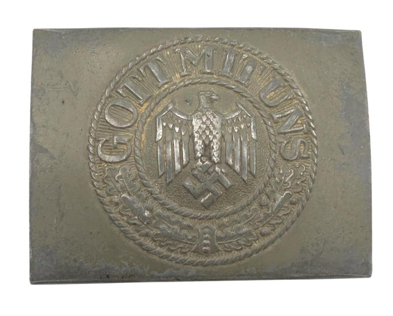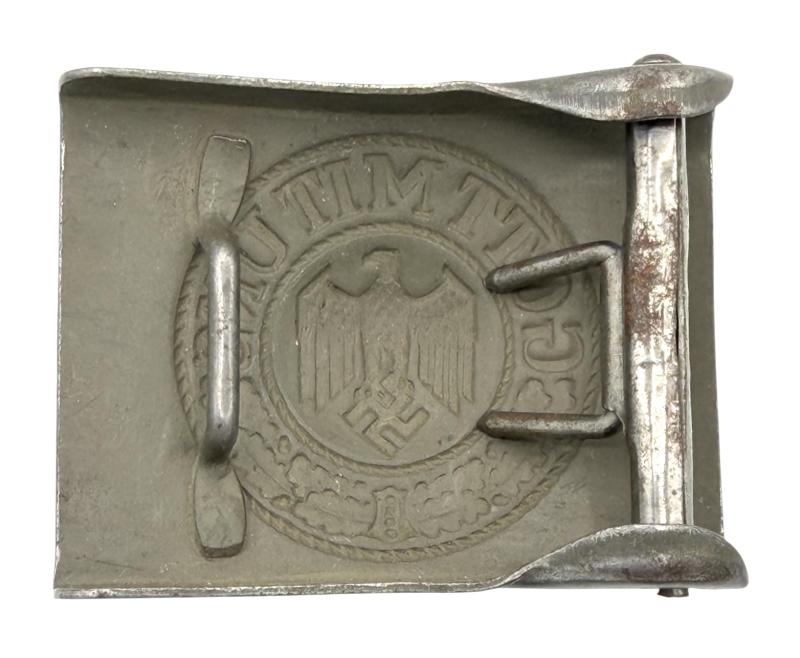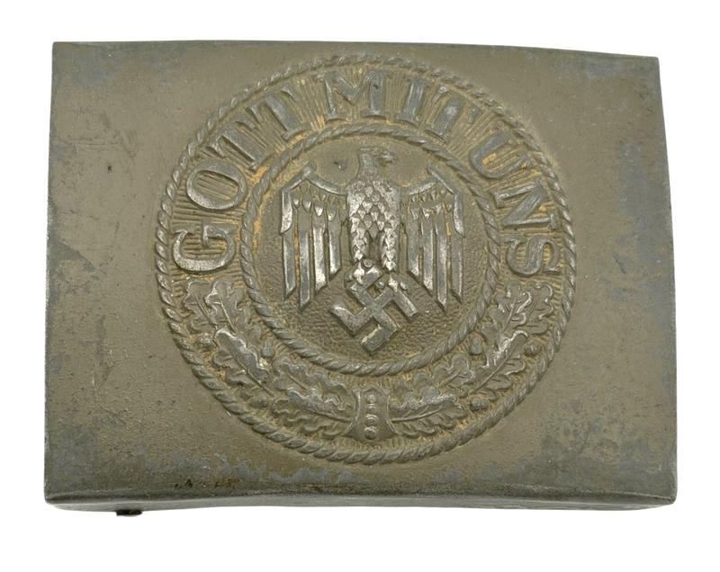 Wehrmacht steel Belt Buckle Nice used un-marked Wehrmacht steel belt buckle In 95% of its original field/grey camo paint. In used but in very good condition. Great to complete a nice Wehrmacht combat belt.