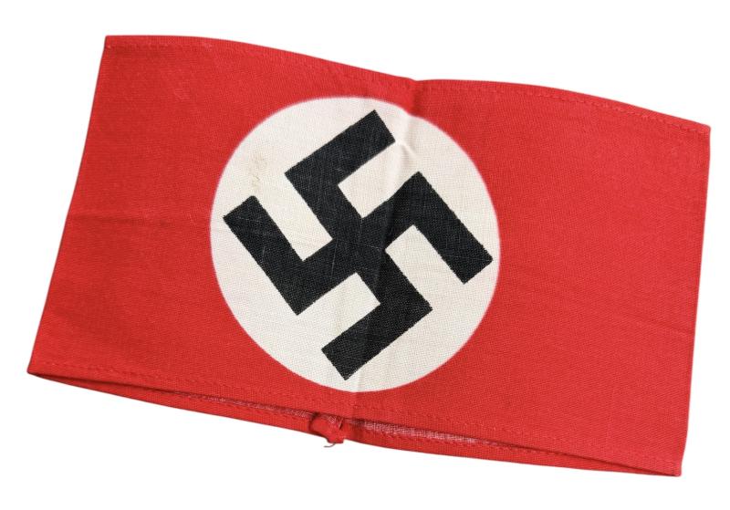 SA/NSDAP Swastika Armband Nice late printed sample of the SA/NSDAP swastika armband. Worm on all kinds SA/NSDAP related tunics. In usec but in very good condition.