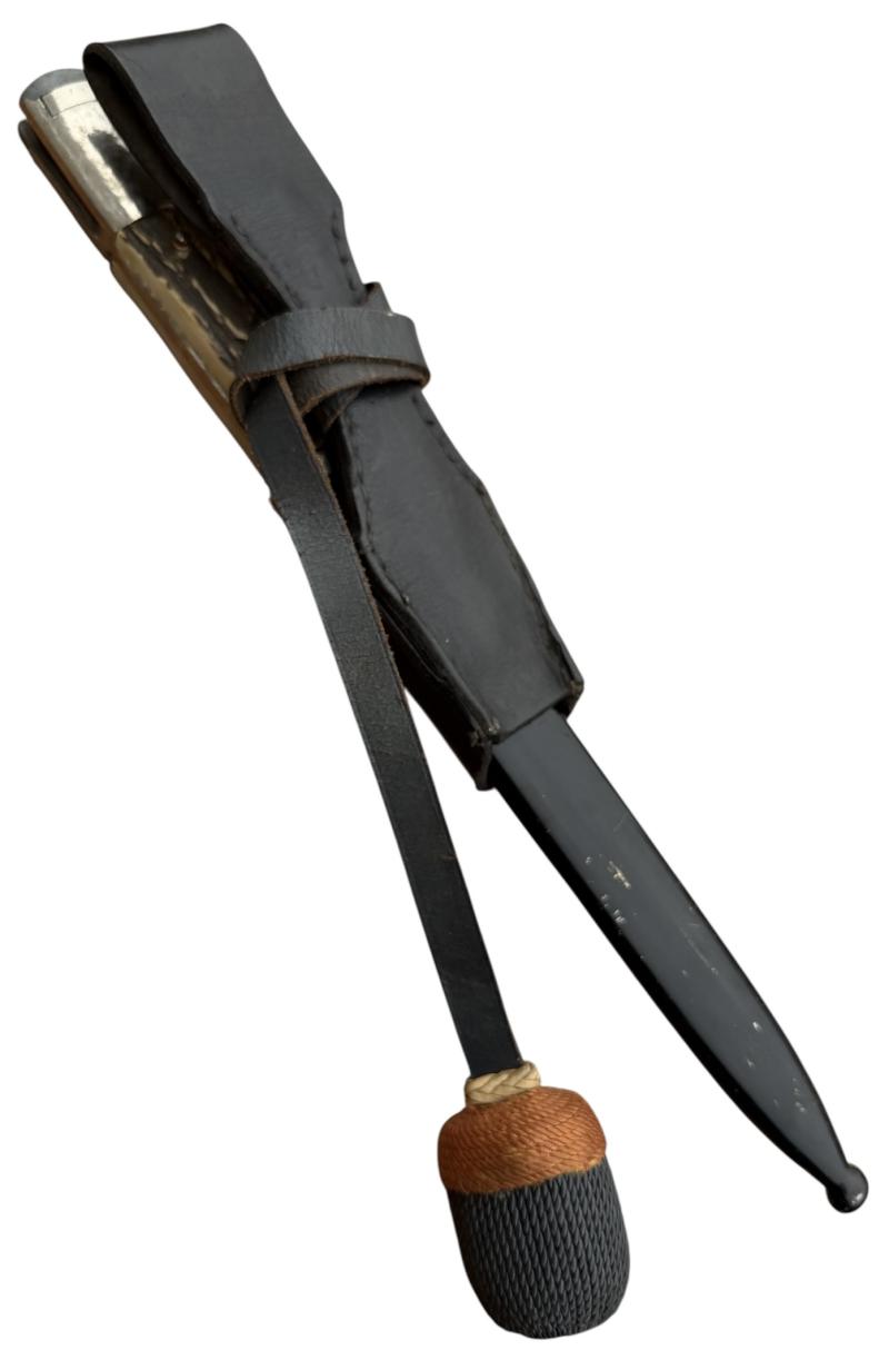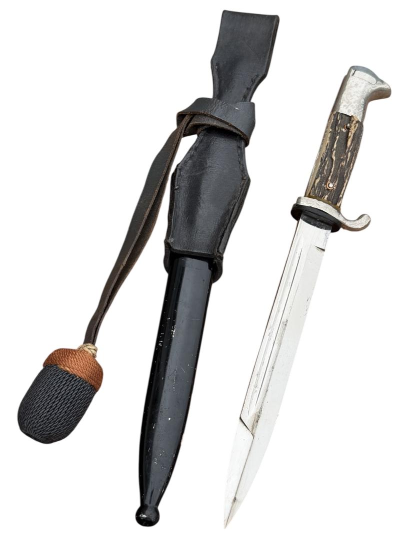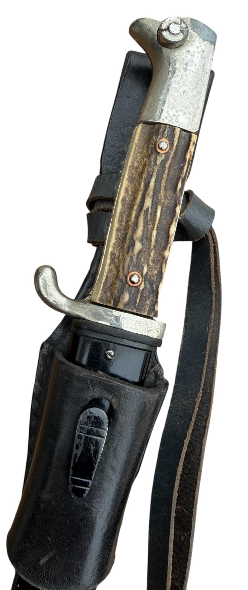 Used but very nice Wehrmacht dress bayonet with its original metal scabbard in its original black paint with leather frog and porte pé. With so-called “Stag Horn” grips. Non maker marked. With “Artillery” felt present