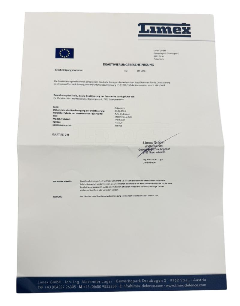 De-activated according EU Law) sold to people over years !! The EU regulation 2015/2403 came about as a result of the attacks in Paris. The regulation applies throughout Europe. In all EU countries, weapons must be disarmed in the manner described in the EU regulation. The disarmed weapons then no longer have to be seen as firearms. The weapons must be provided with a certificate from 1 of the controlling authorities from 1 of the EU countries. They must also be marked by stamped stamps showing the deactivation. From our private collection.