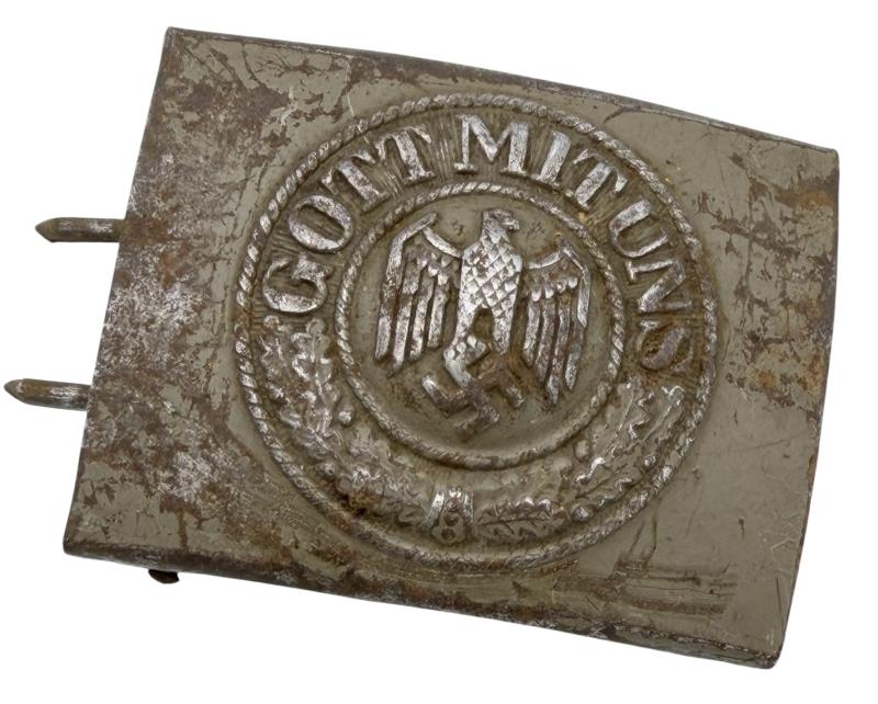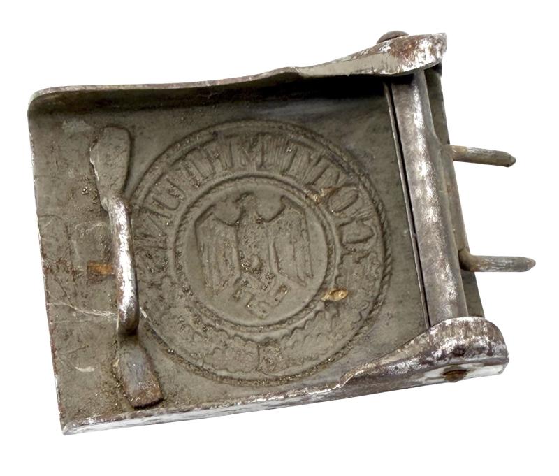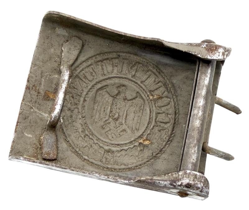 Wehrmacht steel Belt Buckle Nice used un-marked Wehrmacht steel belt buckle In 80% of its original field/grey camo paint. In used but in very good condition. Great to complete a nice Wehrmacht combat belt.
