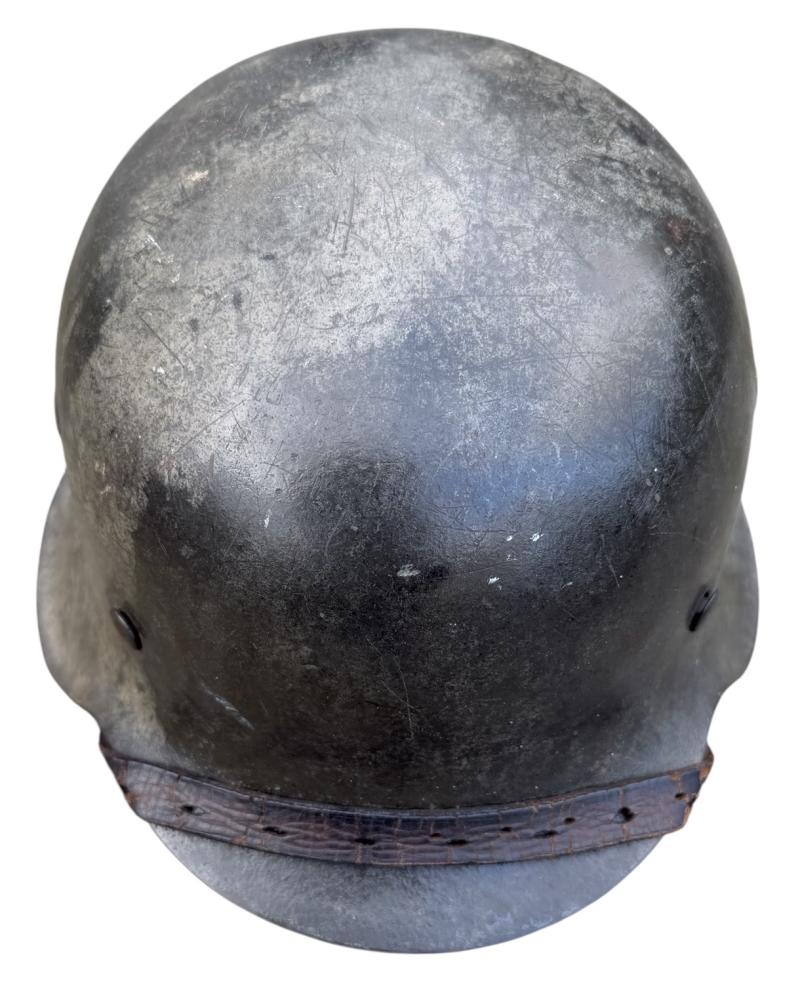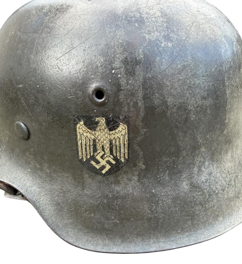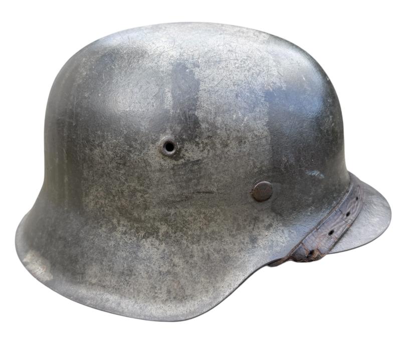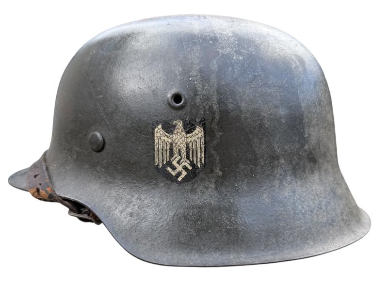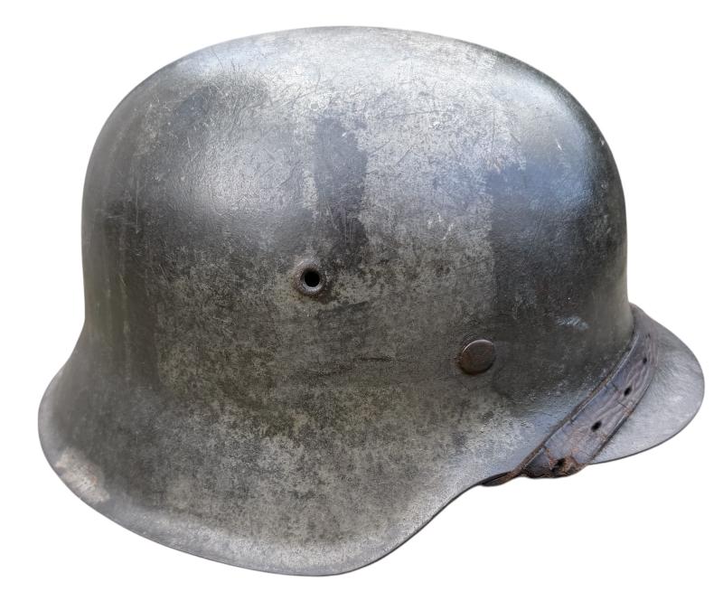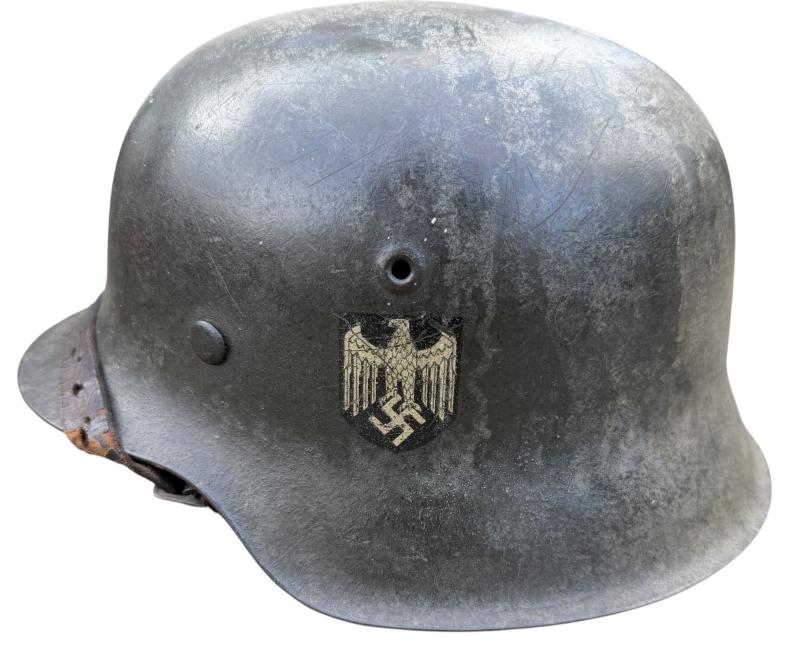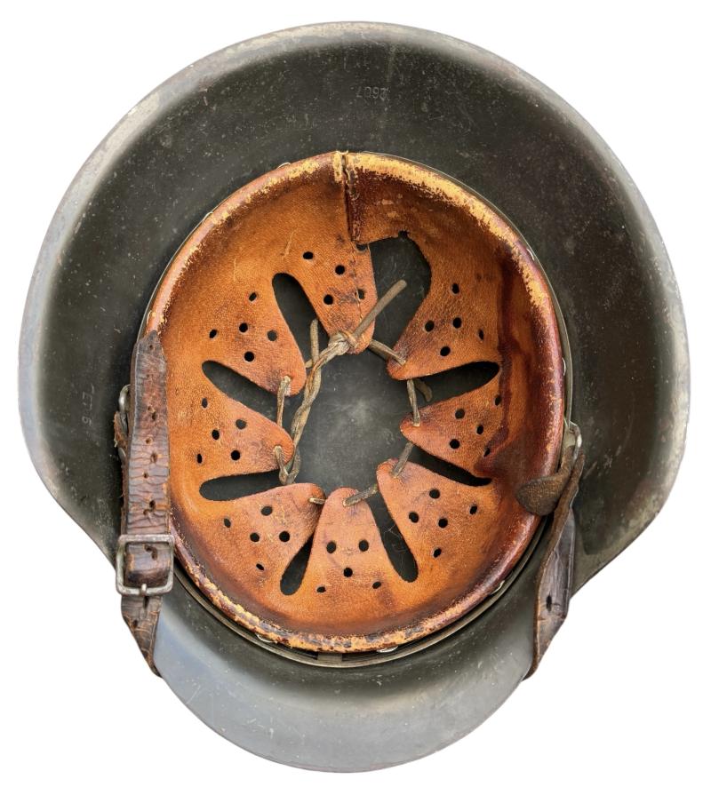 Very nice used and untouched Wehrmacht M42 SD two tone camo helmet. Maker code marked “ET” which is “Eisenhuttenwerk Thale” in size “66” its original liner in size “58”. The liner string is period replaced by a leather string. Complete with its original leather helmet strap. The Wehrmacht M42 helmet comes with a two tone camo paint. The basic field/grey camo paint with a grey/white camo paint on top. The decal is in 98% condition.
