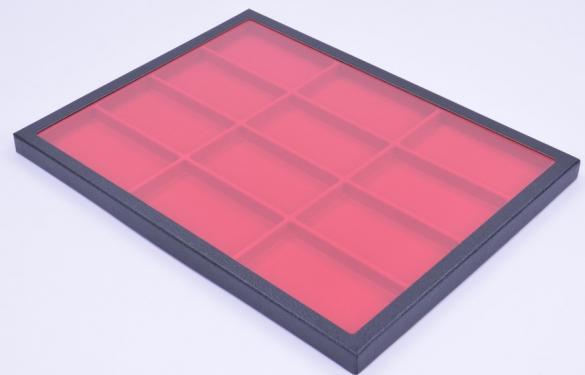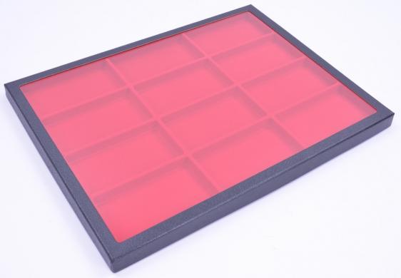 Produced in a black chipboard bottom and border with a glass top and a plastic 12 Red Coloured Compartments plate inside.