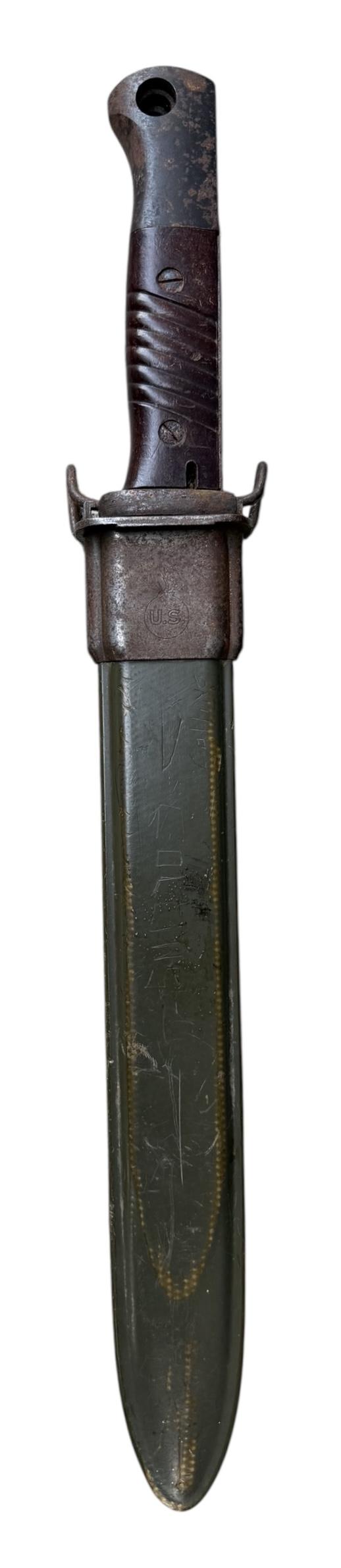 K98 bayonet maker marked “44 FFO” in an American WW2 veteran’s “Garand” bayonet scabbard.