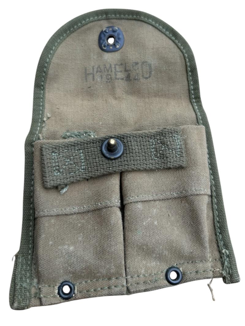 Would hold 2 box magazines each 15 rounds Cal.30 M1 Carbine ammunition. Made by “Hamel Co.”