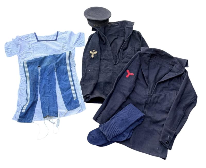 Very nice used British WW2 merchand navy tunic grouping. With salors Had (H.M.S.) 2 wool salor shirts