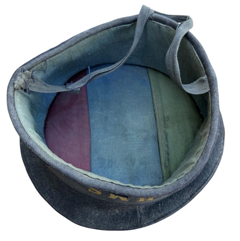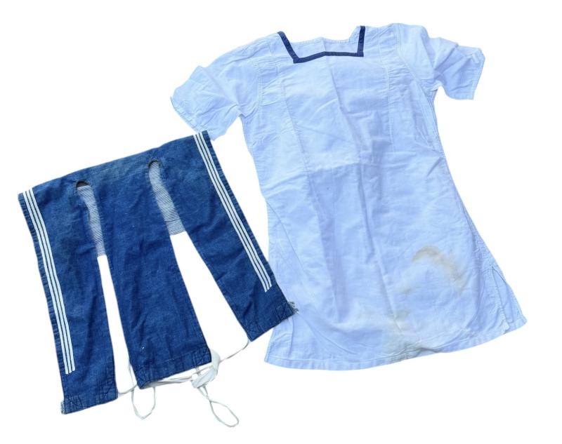 With woven (Stoker) sleeve patch (one woven in red tread, one in gold) a regular white British salors shirt and a blue salors collar, wool socks and a money belt. All in used but in very good condition. Great on a buste in a display!