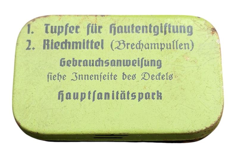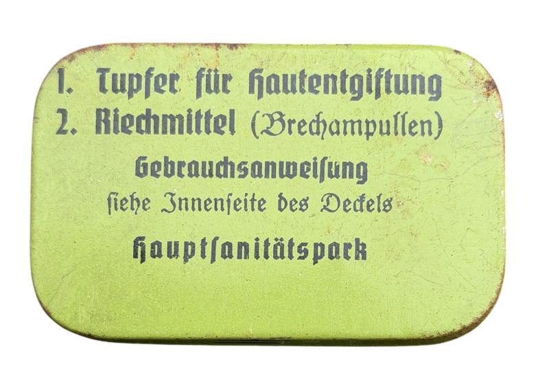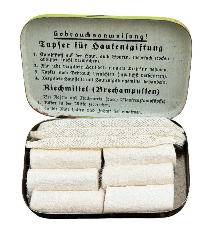 Nice metal Wehrmacht case with combat gas set protection kit. “Tupfer für Hautentgiftung”