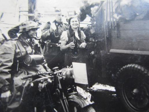 SS Potograph of an SS VT Training "Ubungs Fahrt" May 1940 with SS motorcycle and SS Krupp proze. The SS VT soldiers wearing training bands on there helmets In good condition!