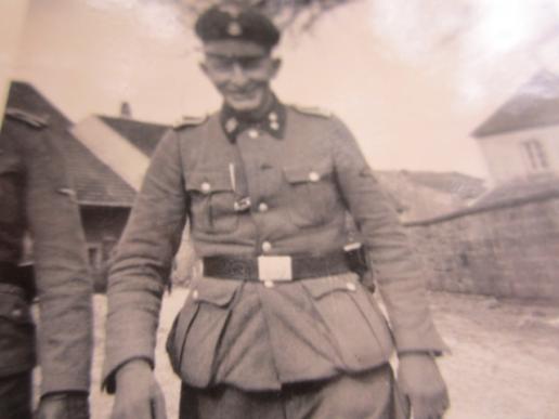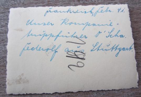 SS Photograph with waffen SS NCO "Waffen SS Oberscharfuhrer" With the text on the back "Unsere Kompanie Truppfuhrer Oscha Federolf aus Stuttgart"