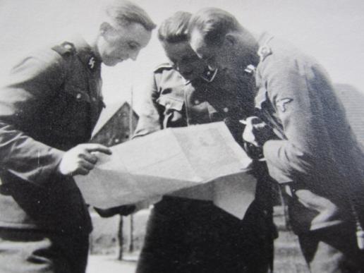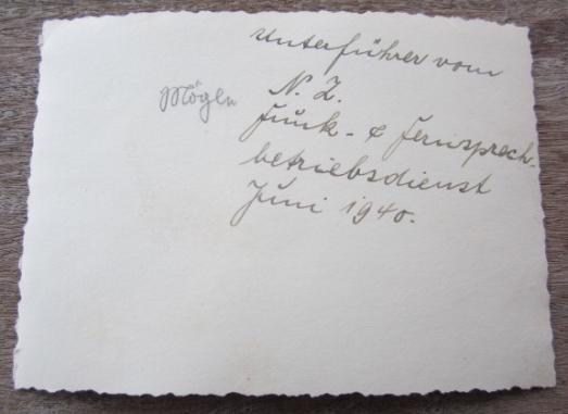 SS Photograph with SS Soldier an two SS NCO's With text on the back "Unterfuhrer N.Z. Funk & Fernsprech Betriebsdienst Juni 1940" in good condition!