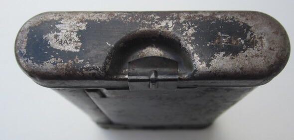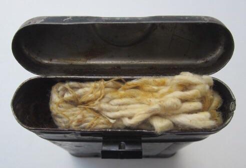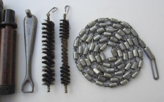 K98 Cleaning Kit Nice maker marked K98 cleaning kit "QD" and dated 1938 Complete with bakelite oil can, tool, chain and the two bruches In 85% of its original field grey paint In very good condition.