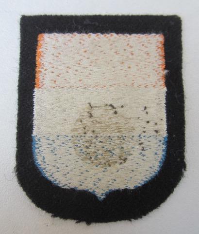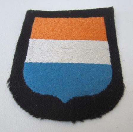 Dutch WaffenSS Sleeve Shield Dachau made Dutch WaffenSS sleeve shield "Orange, White Blue" for the "23 SS Freiwilligen-Panzergrenadier-Division Nederland" In very good condition.