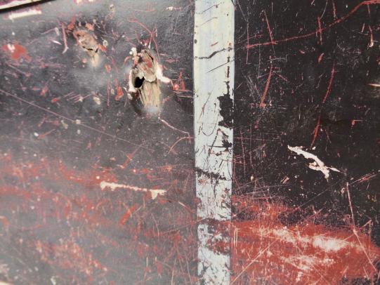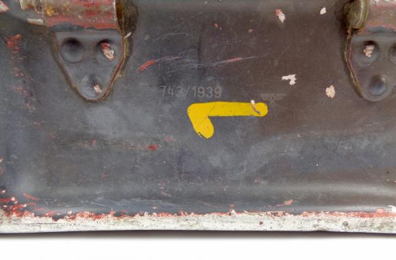 Very nice combat used aluminium MG34/42 ammo case. In original paint and with grenade shrapnell combat damage! Dated "1939" with numbers painted on the outside. In used but good condition.