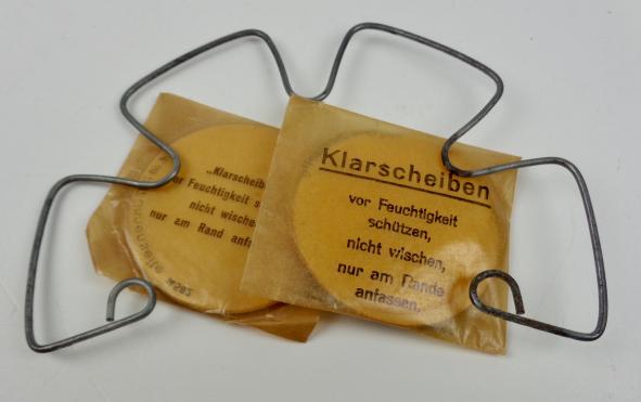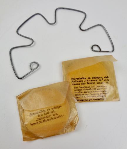 Wehrmacht M31 Gasmask Cleaning Cloth Spring Nice used cleaning cloth spring for the M31 gasmask With two packages of "Klarscheiben" Nice set to complete your M31 gasmask