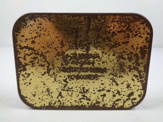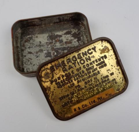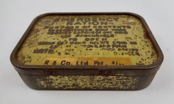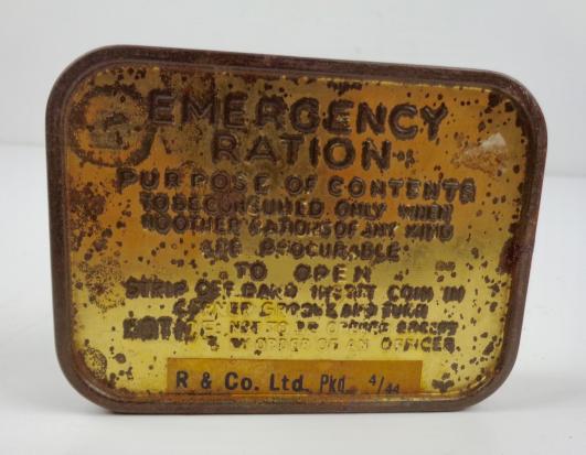 British WW2 Emercency Ration Tin Very nice metal tin, British WW2 enercency ration. With nice paper label “R. & Co. Ltd. pkd 4/44” In used but very good condition.