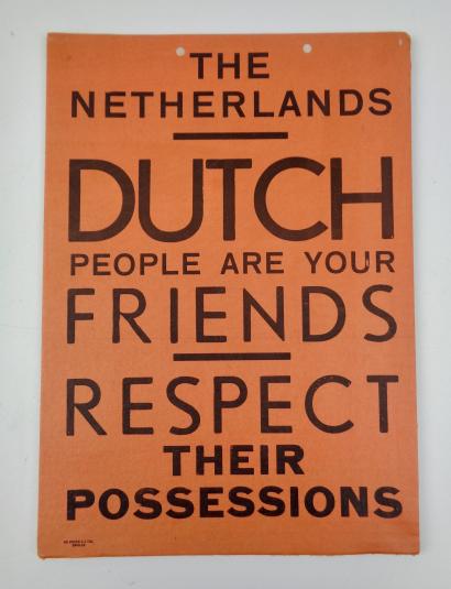 Very nice small Allied poster, unfortunatly glued on carton. “The Netherlands, Dutch people are your friends, Respect their Possessions”