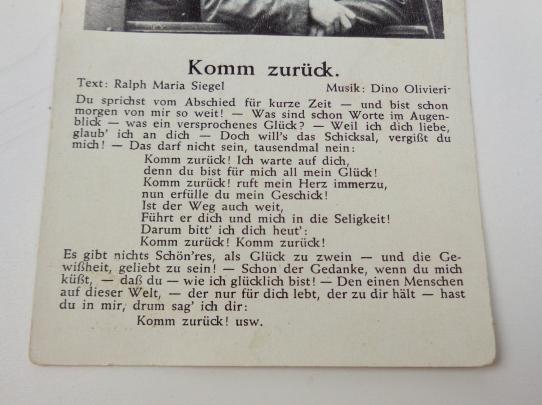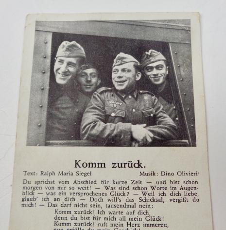 Wehrmacht Postcard Nice Wehrmacht postcard with Wehrmacht soldiers on a train and the text of a song. In very good condition.