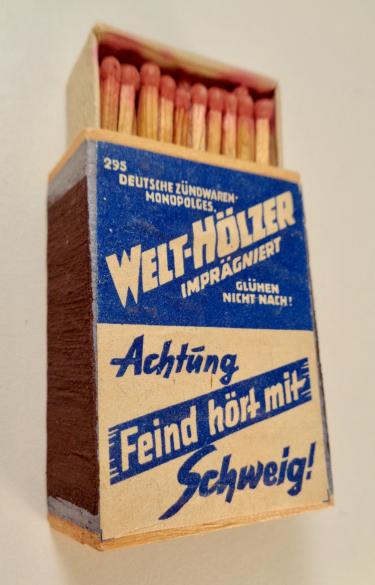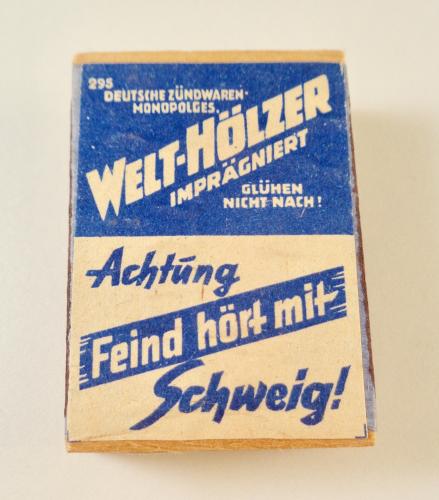 Third Reich era Matchbox Very nice Third Reich era matchbox with content With propaganda on the cover "Achtung Feind hört mit Schweig!" made bij match factory "Welt-Hölzer" In very good condition.