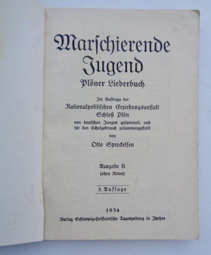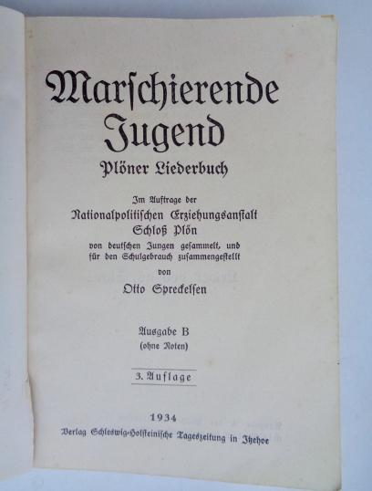 Napola Song Book “Marschierende Jugend” Plöner liederbuch Song book made for “Nationalpolitischen Erziehungsanstalt Schloss Plön” (Napola) Dated “1934” in used but very good condition.