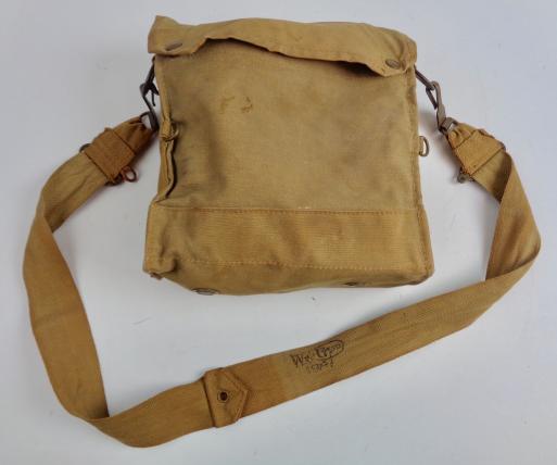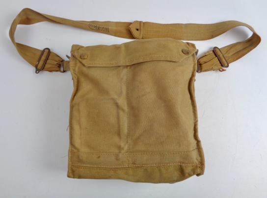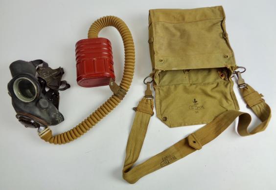 Very nice near mint British WW2 1e model gas mask with extra long tube - especially issued for drivers. In nice early gasmask pouch. The pouch and strap are both nicely maker marked and dated “1941” and manufactured by W&G - Waring and Gillow and well known canvas producer.